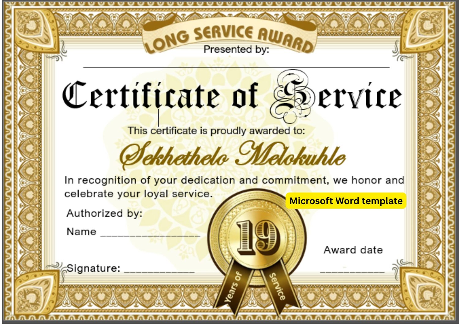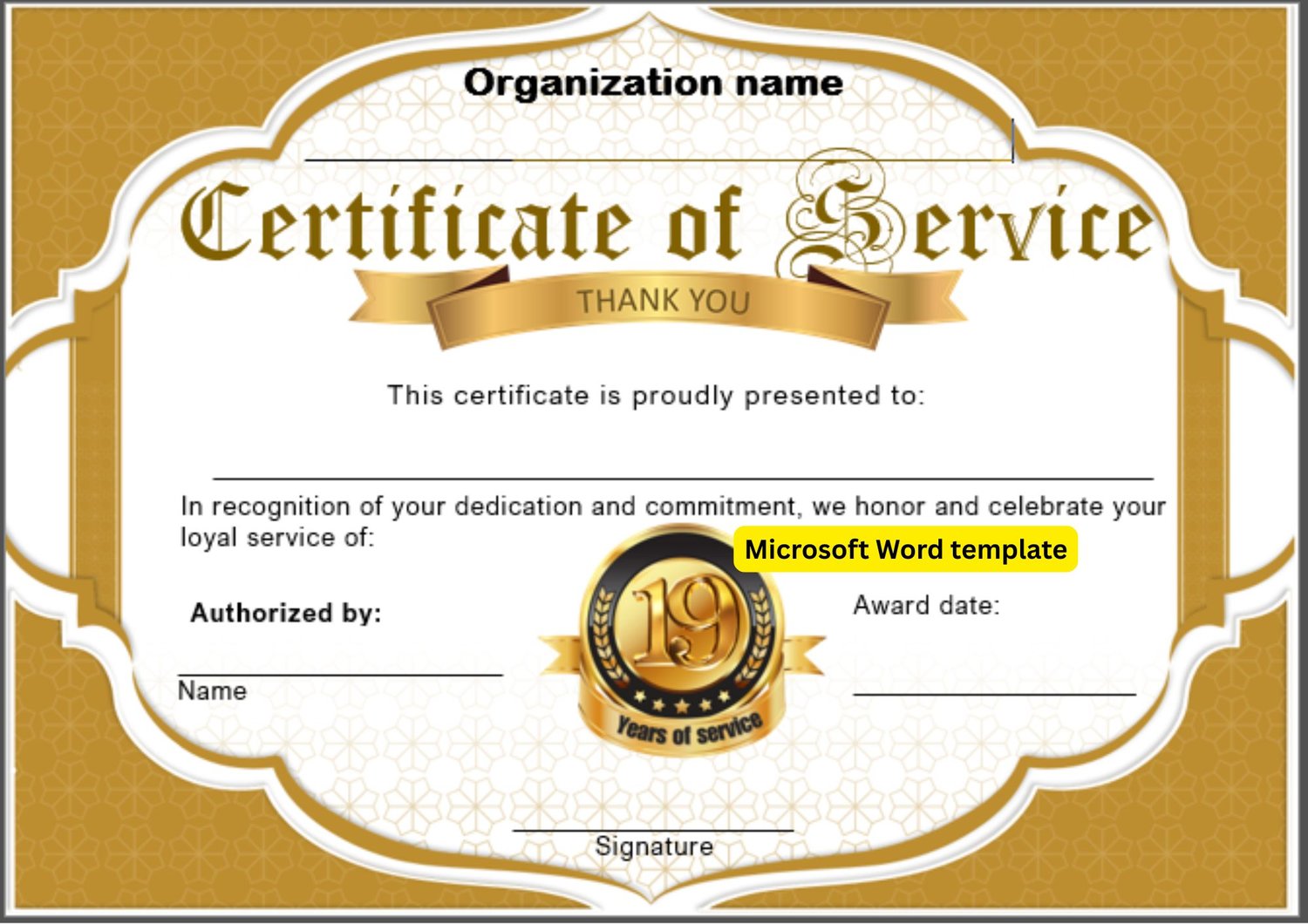 Celebrate a milestone achievement with our beautifully crafted "19 Years of Service" Certificate Template