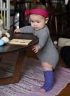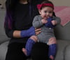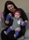 The model has a 7.5” {19cm} calf circumference (the largest circumference around worn as shown) and wearing the second size. The model is 6mo old.