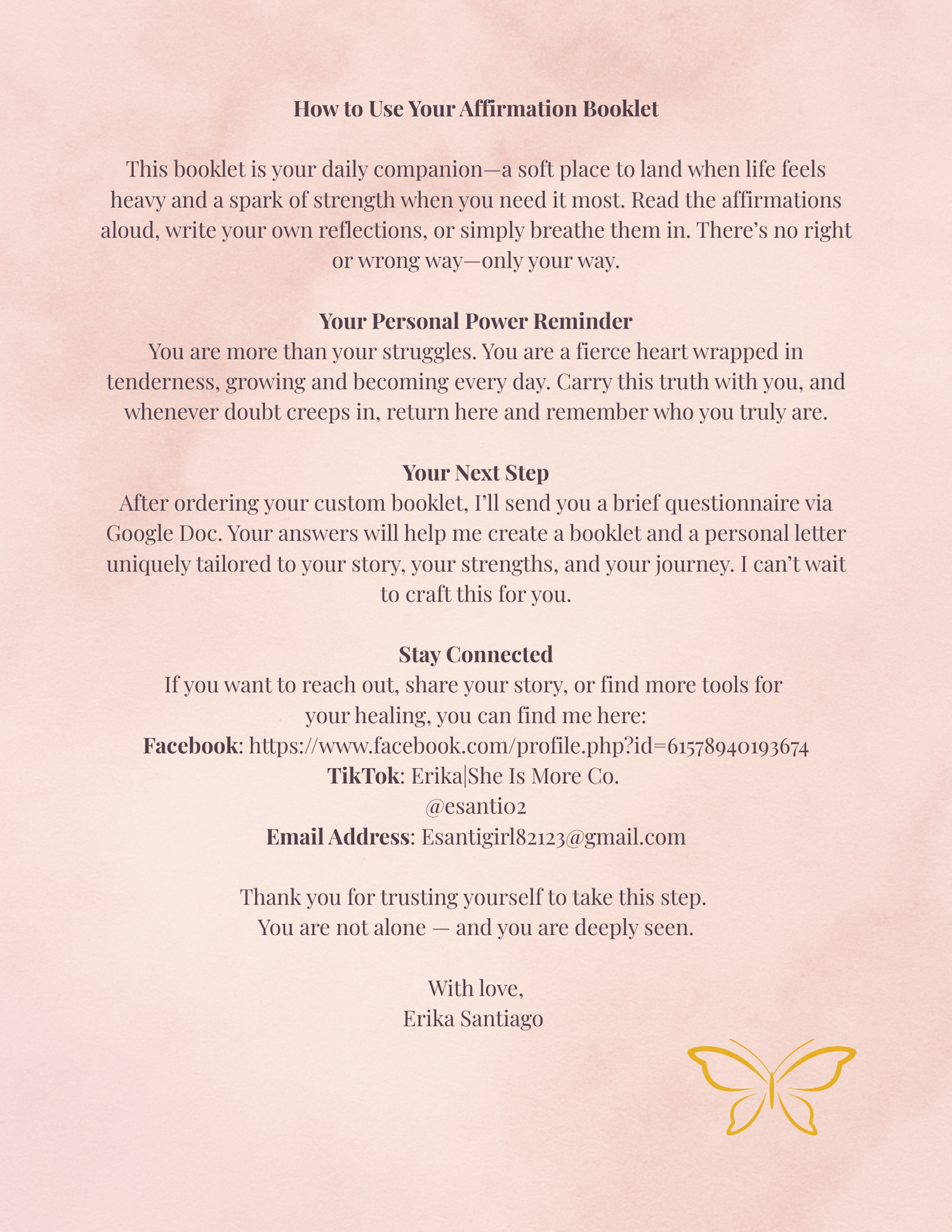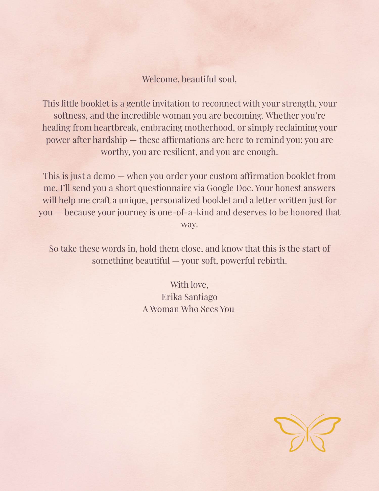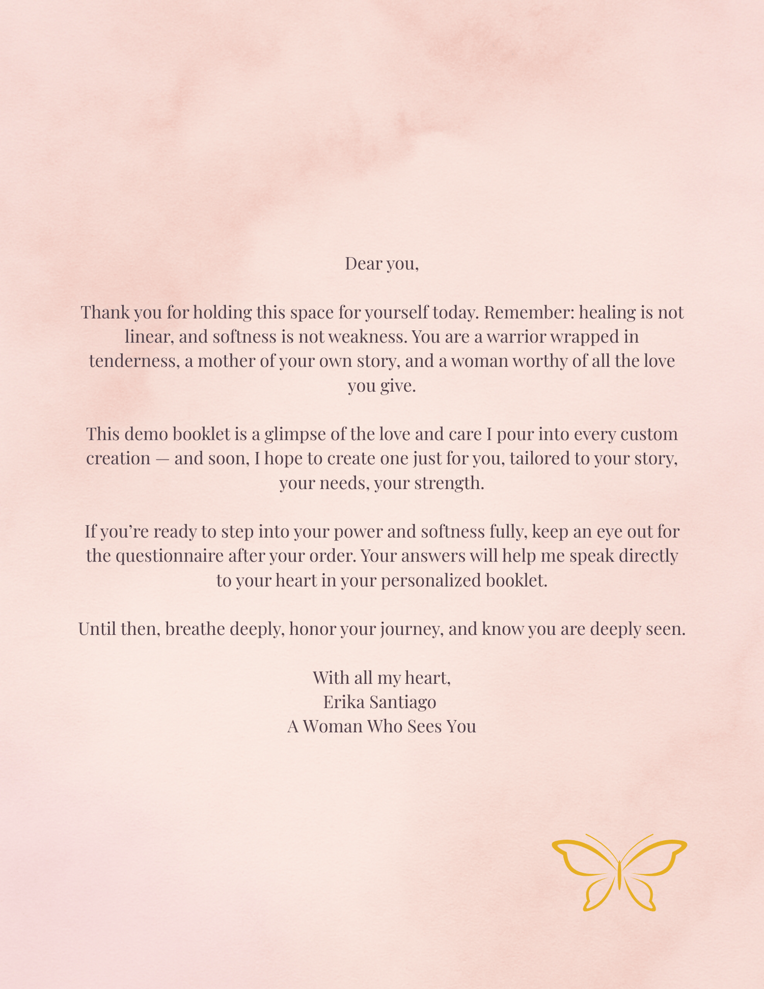 This demo gives you a heartfelt glimpse into the full personalized experience — a preview of the affirmations and support you can expect when you order your custom booklet. After purchase, you’ll receive a personalized questionnaire to help me craft a booklet tailored uniquely to your journey.