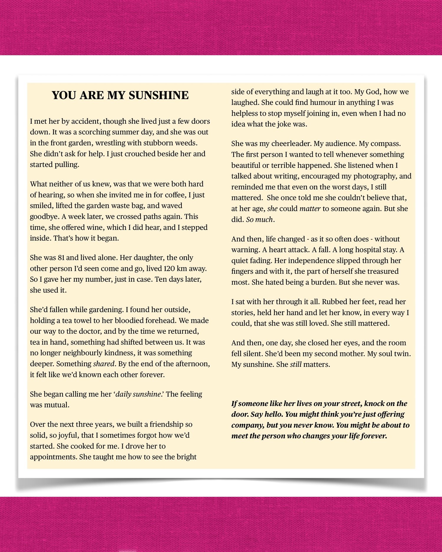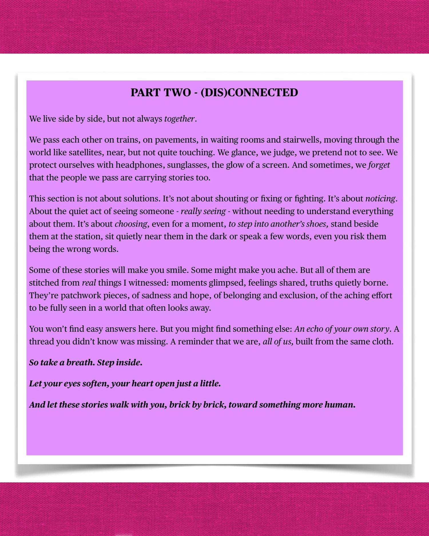 Real-world stories stitched from moments of noticing - on trains, in waiting rooms, in the quiet gaps between people. These stories don’t shout. They sit beside you gently and say: