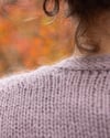 Krea Deluxe Deluxe Silk Mohair (45 % silk, 33 % mohair, 22 % baby alpaca, 20 g / 262 yds / 240 m / skein). You need approx. 4 (5, 5, 5, 6, 6) (7, 7, 8, 9) or 858 (1113, 1129, 1271, 1379, 1486) (1642, 1822, 2066, 2287) yds/ 783 (1015, 1029, 1159; 1258, 1355) (1498, 1662, 1884, 2085) m. Colorway is 44 (lavender).