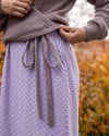 Krea Deluxe Organic Wool 1 (100% Merino wool, 50 g / 159 yds / 145 m / skein). You need approx.: 6 (7, 8, 8, 9, 10) (11, 12, 13, 15) skeins or 858 (1113, 1129, 1271, 1379, 1486) (1642, 1822, 2066, 2287) yds/ 783 (1015, 1029, 1159; 1258, 1355) (1498, 1662, 1884, 2085) m. Colorway is 44 (lavender).
