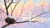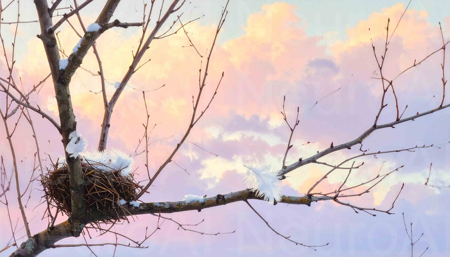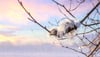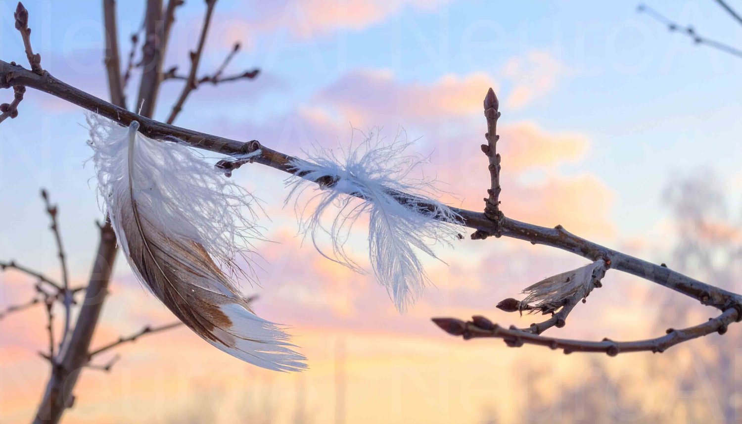 Soft feathers nestled in tree branch against sunset