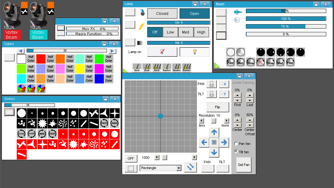 * Verifique, con este Fixture de pruebas (click), que coincidan estos canales: 10 Pan y 12 Tilt.