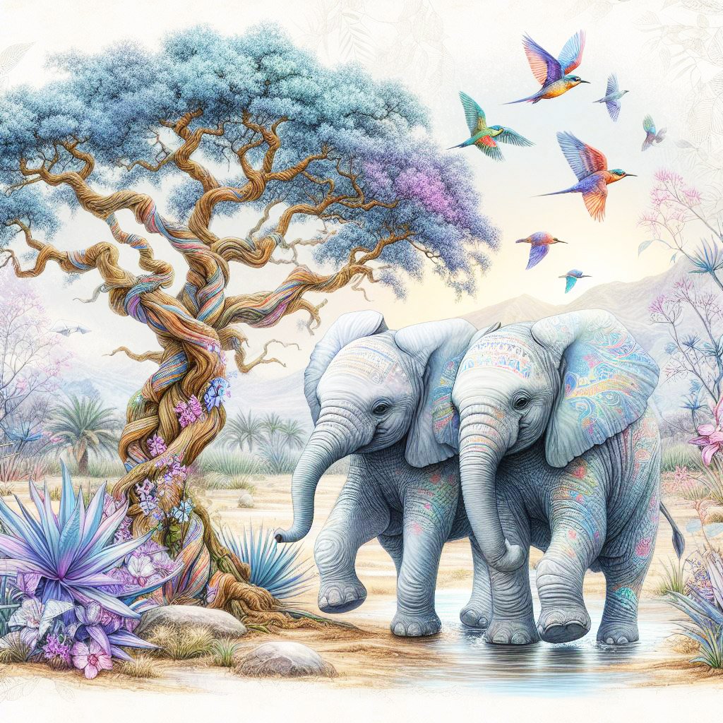 Colourful elephants beside a water hole & beautiful twisted patterned tree. There are humming birds, wild flowers a setting sun.