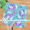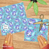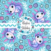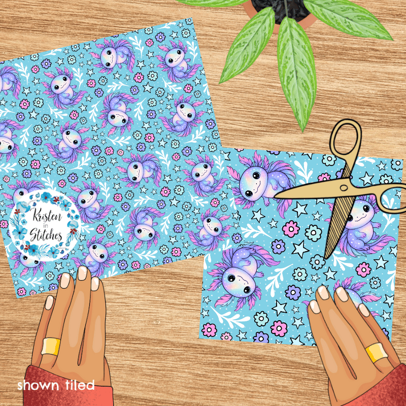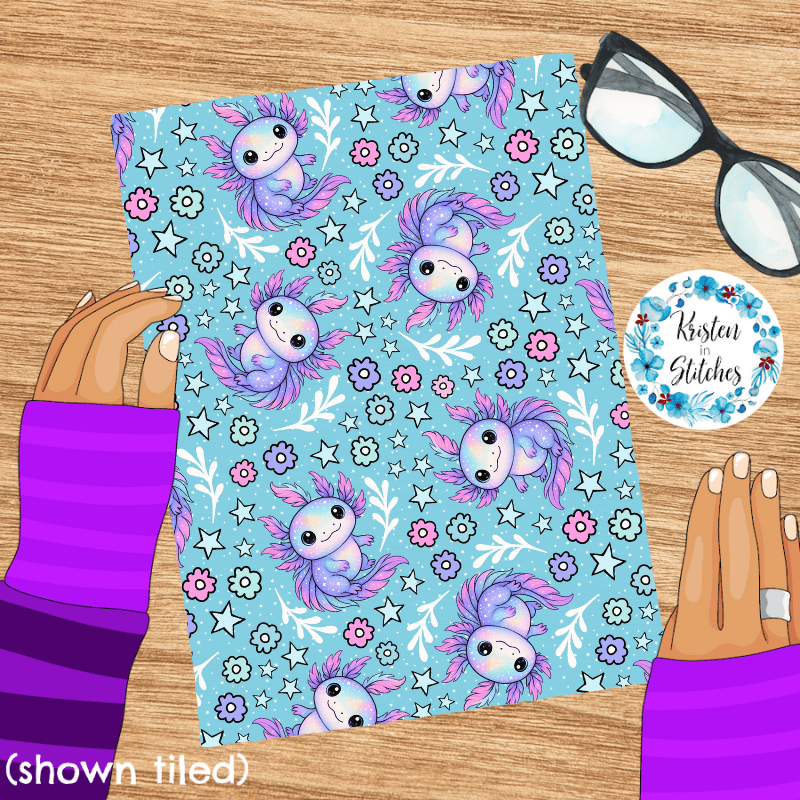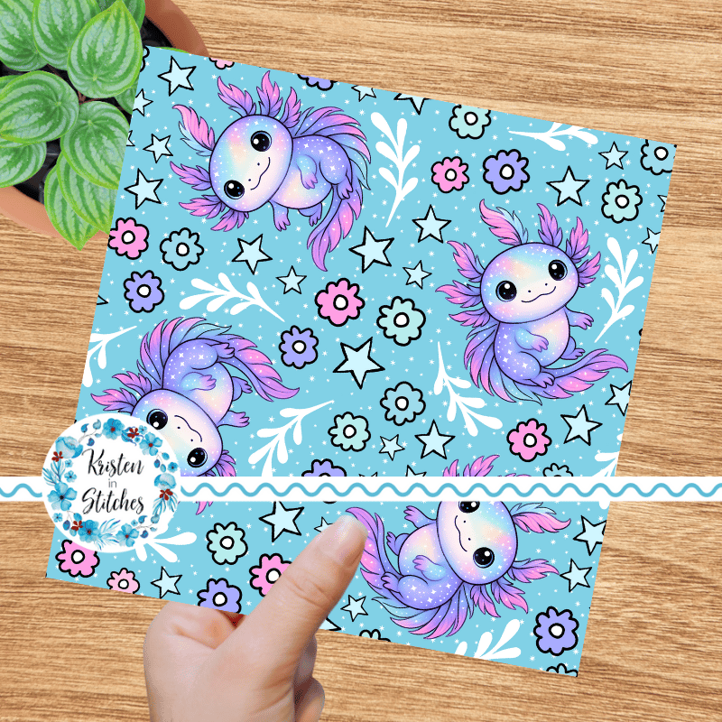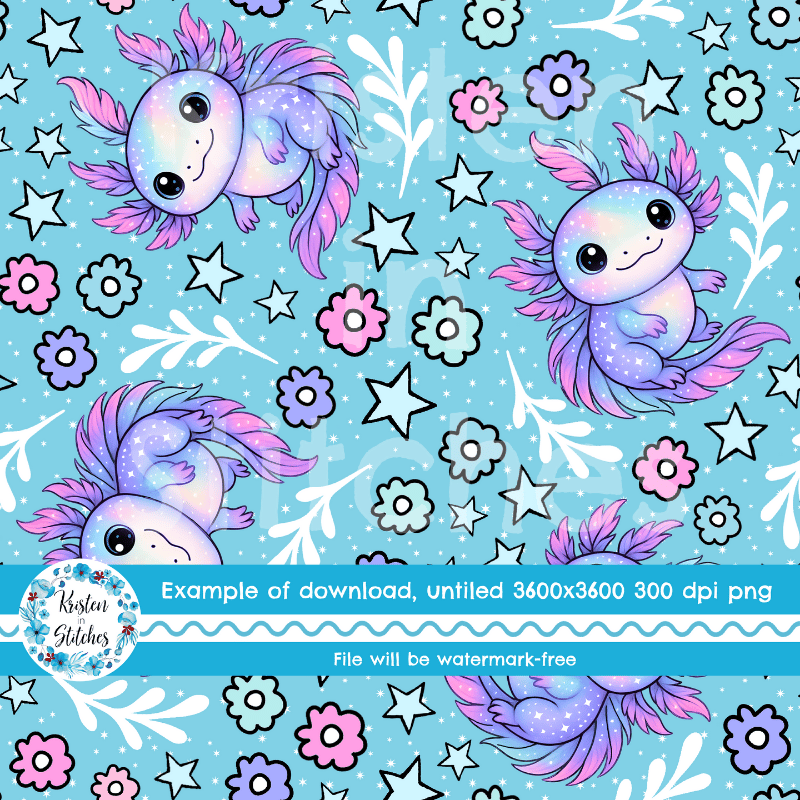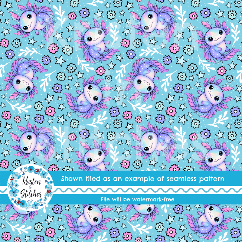 Pastel baby axolotls with flowers and sparkle stars on blue.