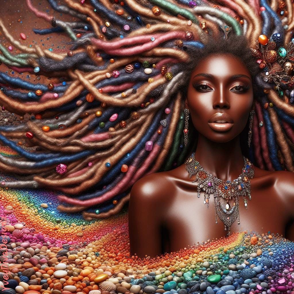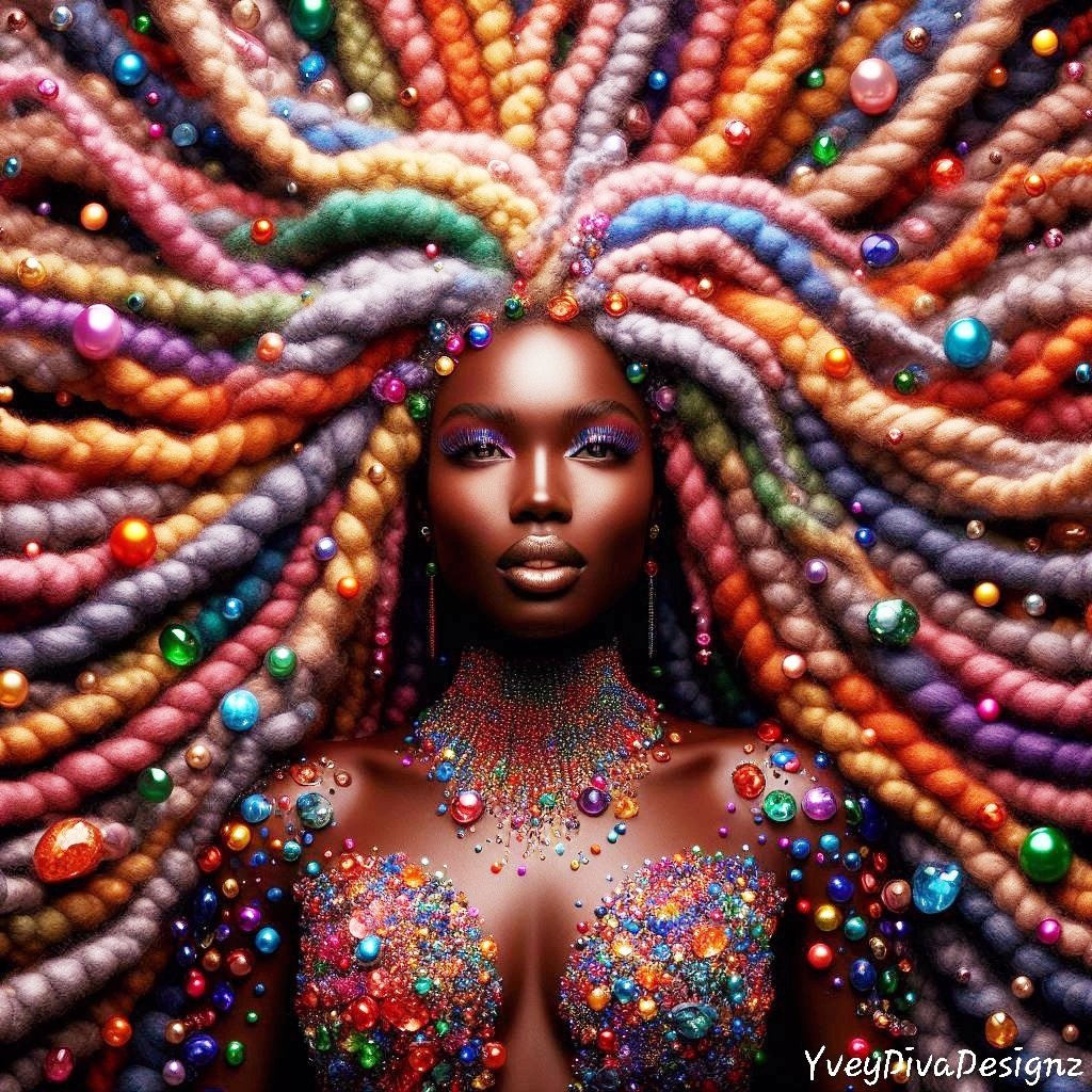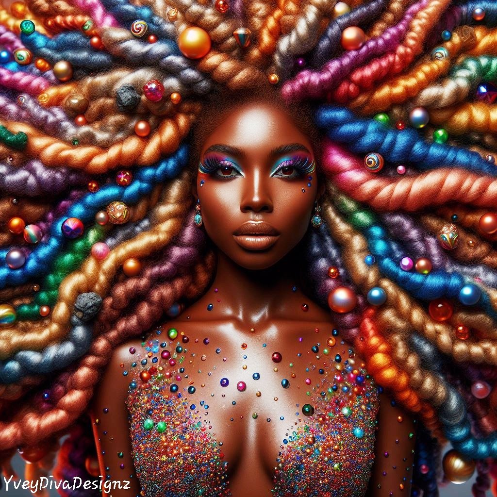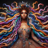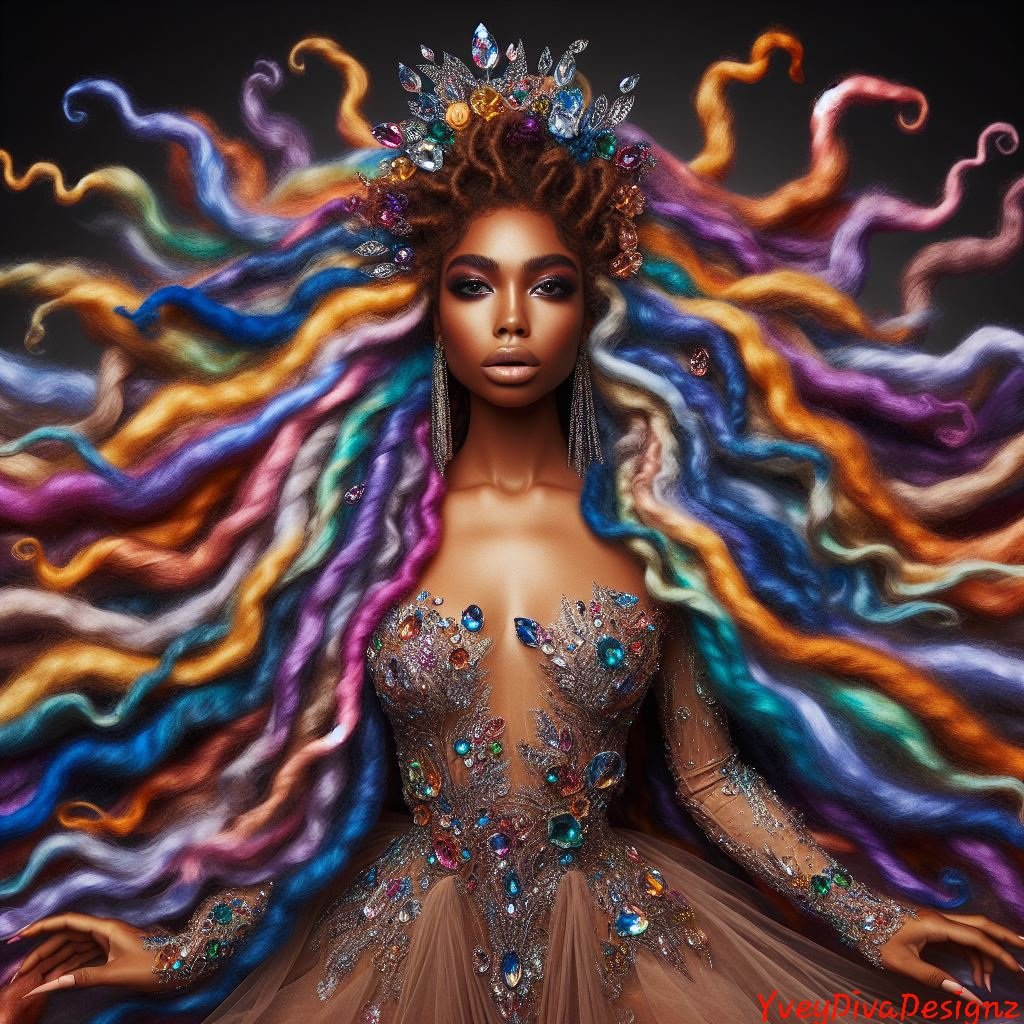 Introducing the Jewel-Tide Quad, four stunning cocoa-brown mermaid sisters, each radiating the mystique of the deep. Their multi-colored locks cascade like vibrant seaweed, flowing in perfect harmony, while their bodies sparkle with ornate jewels that echo the ocean's treasures. These quadrupled sisters are a powerful symbol of unity and grace, enchanting the seas with their beauty and strength.