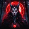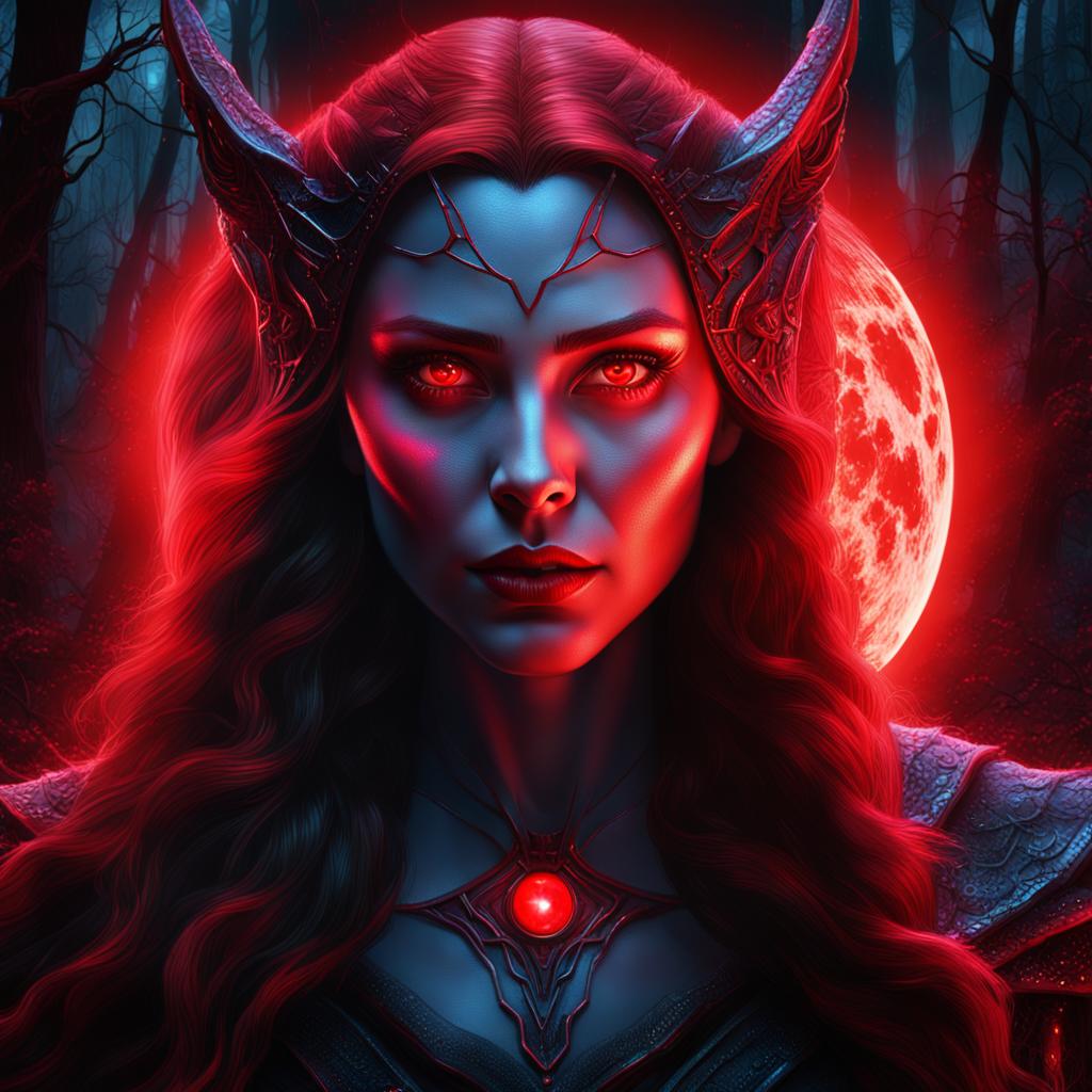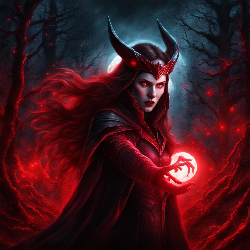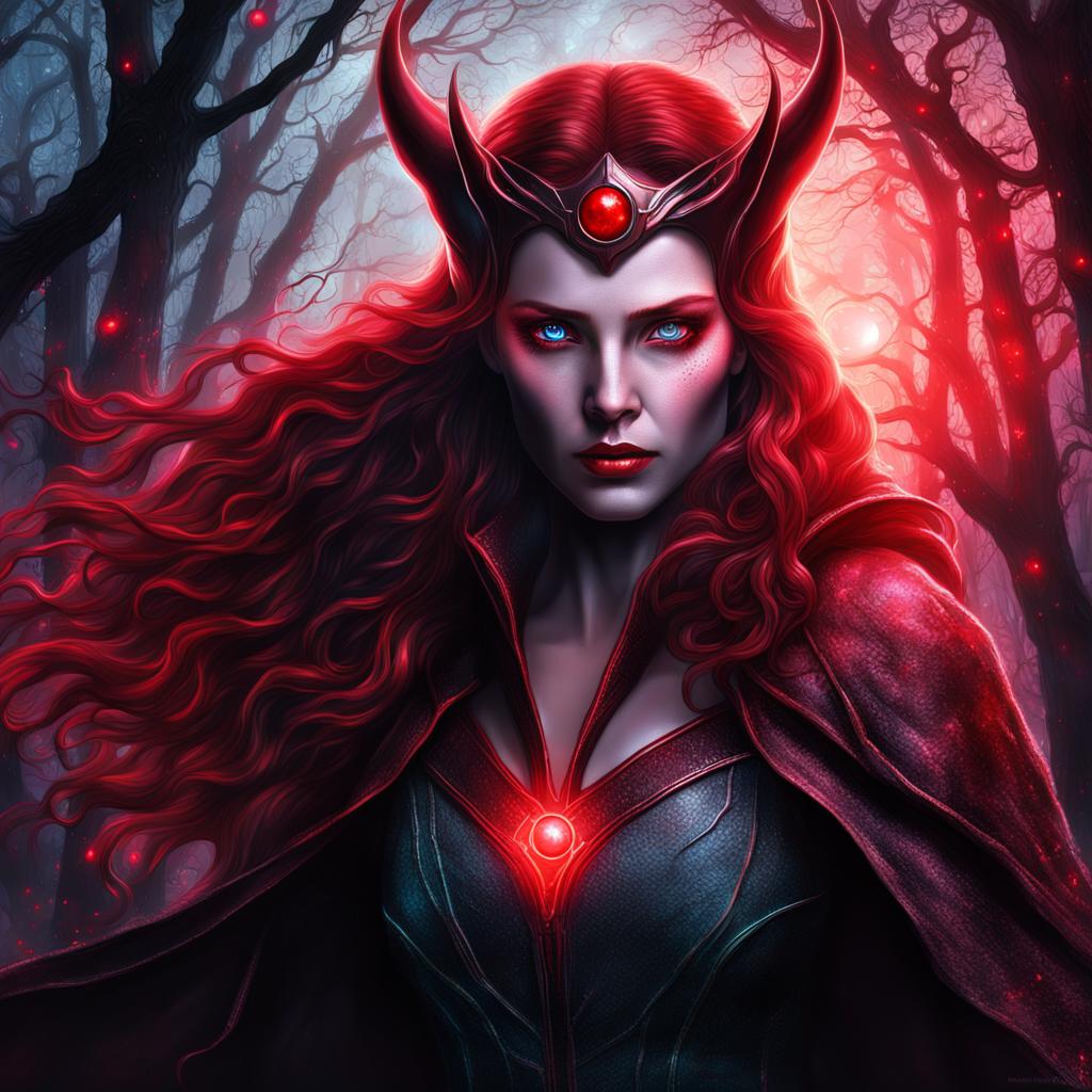 Product Description: Dive into the realm of enchantment with the "Malevolent Scarlet Witch," a mesmerizing digital portrait that encapsulates dark magic and sinister allure. Crafted with unparalleled attention to detail, this photorealistic artwork presents a close-up head and shoulders portrait of a formidable Scarlet Witch, bathed in the eerie glow of a red moon in a mysterious forest.