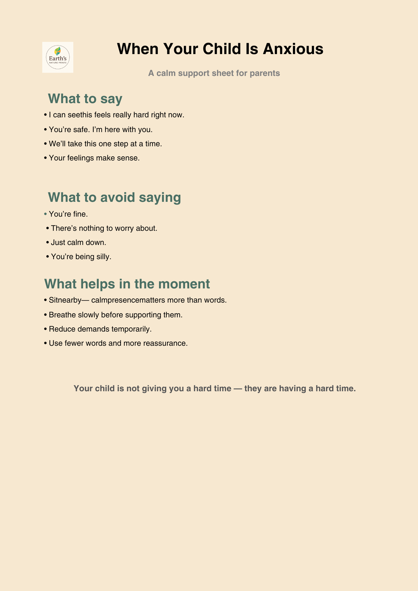 If you’ve ever felt unsure what to say or do when your child is anxious, this gentle support sheet is for you.