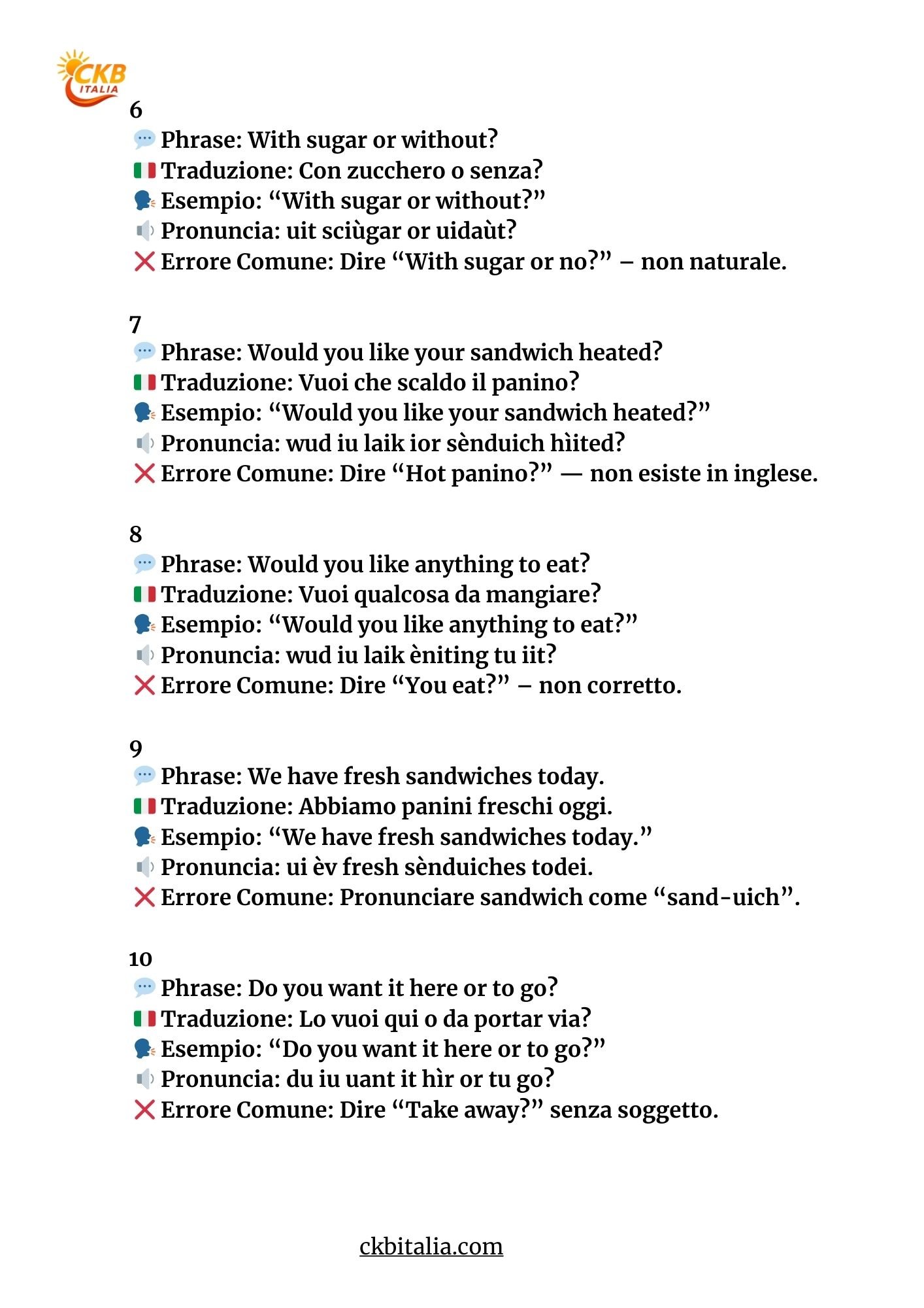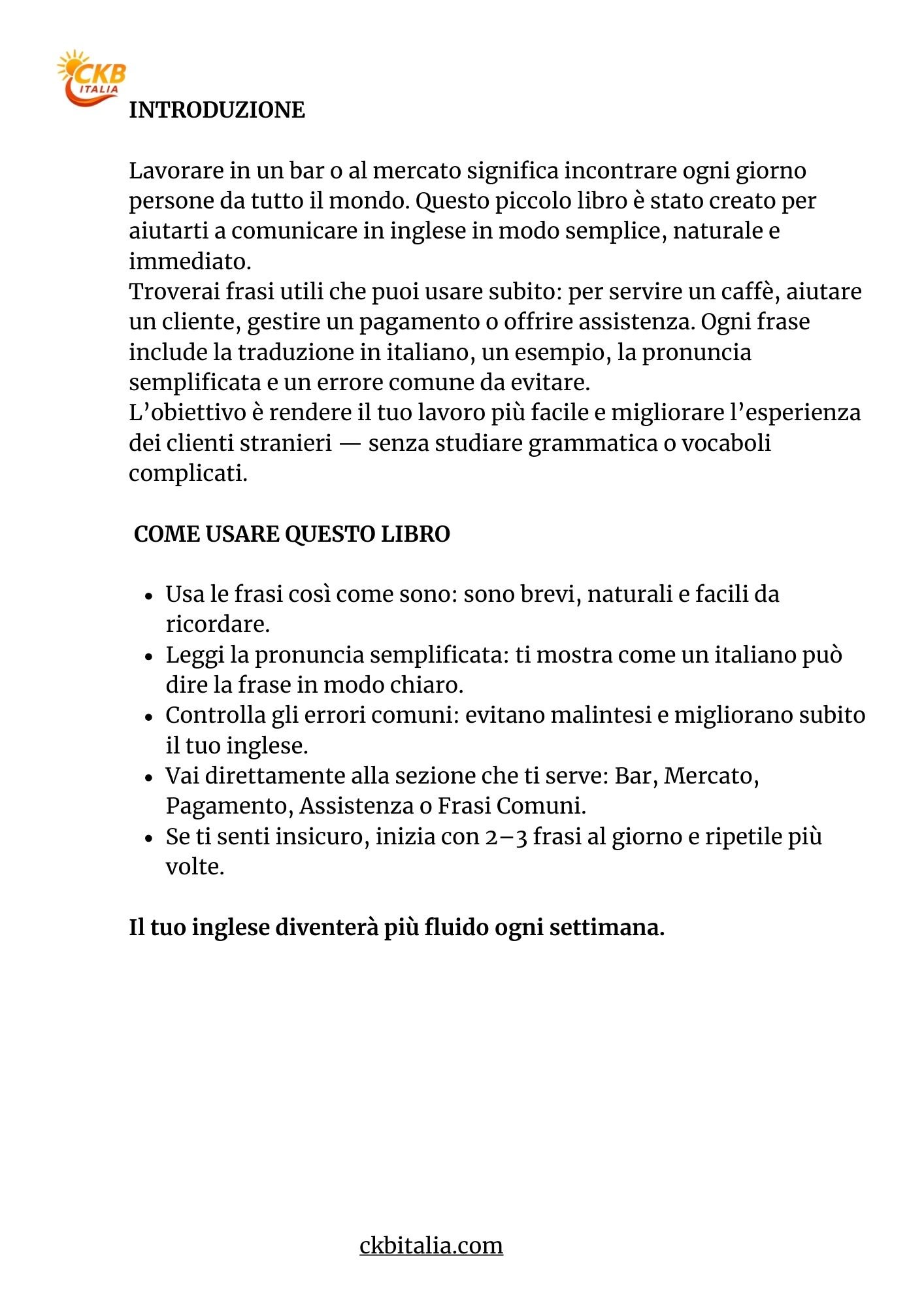 - 50 frasi pratiche divise in 5 sezioni: Bar, Mercato, Pagamento, Assistenza, Frasi Comuni