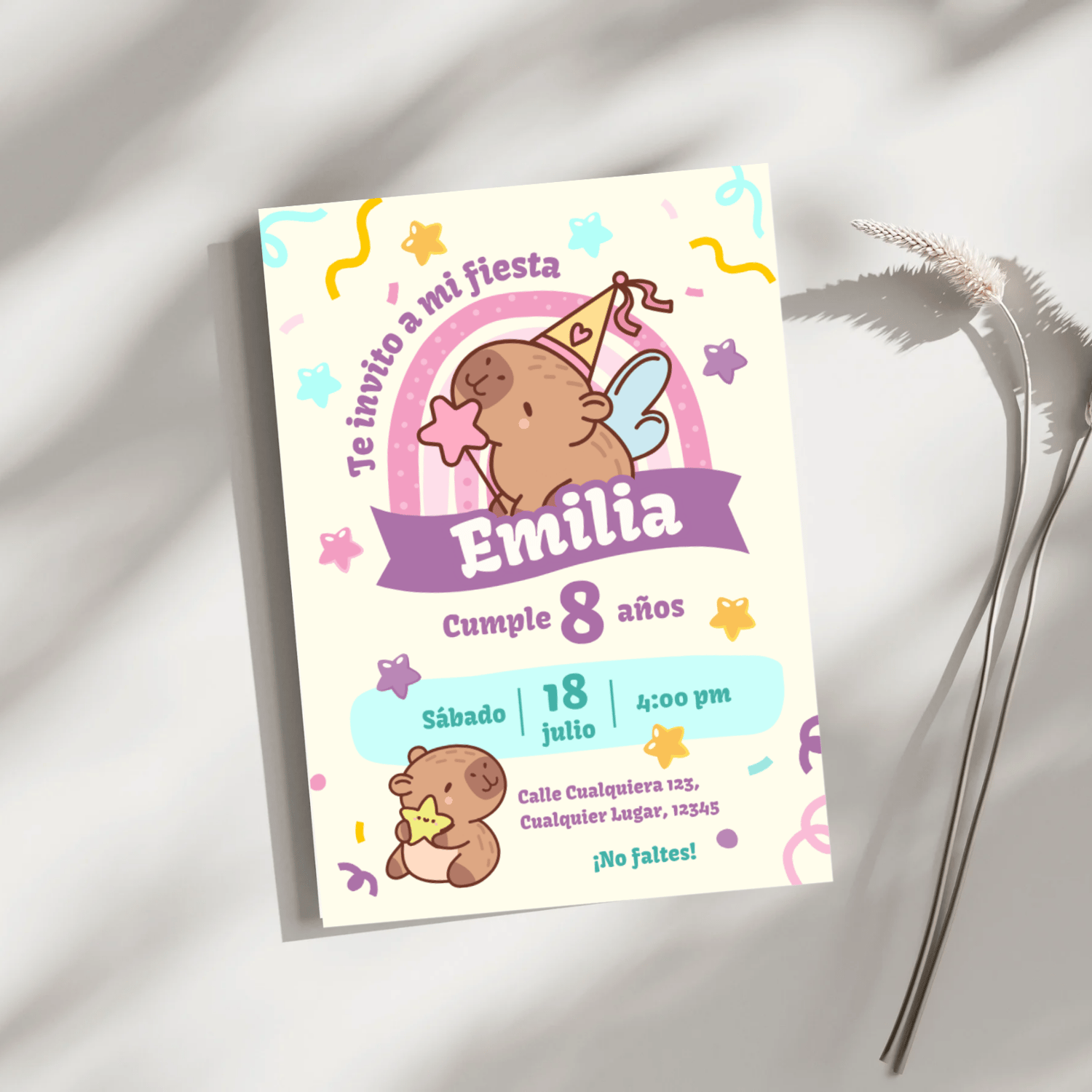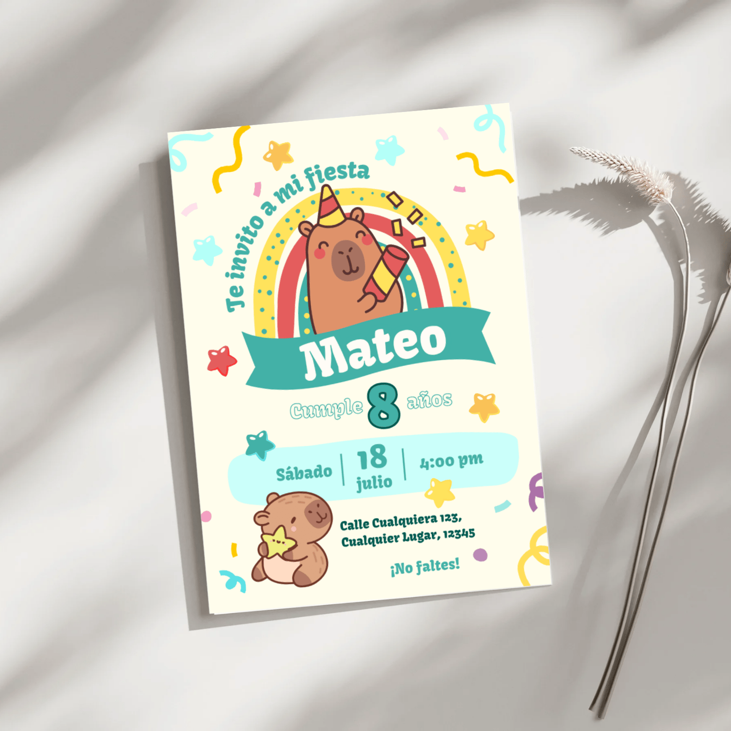 Haz que la fiesta de tu pequeño sea aún más especial con esta tierna invitación digital. Diseñada con adorables Capibaras, colores pastel y detalles festivos, es perfecta tanto para niños como para niñas.