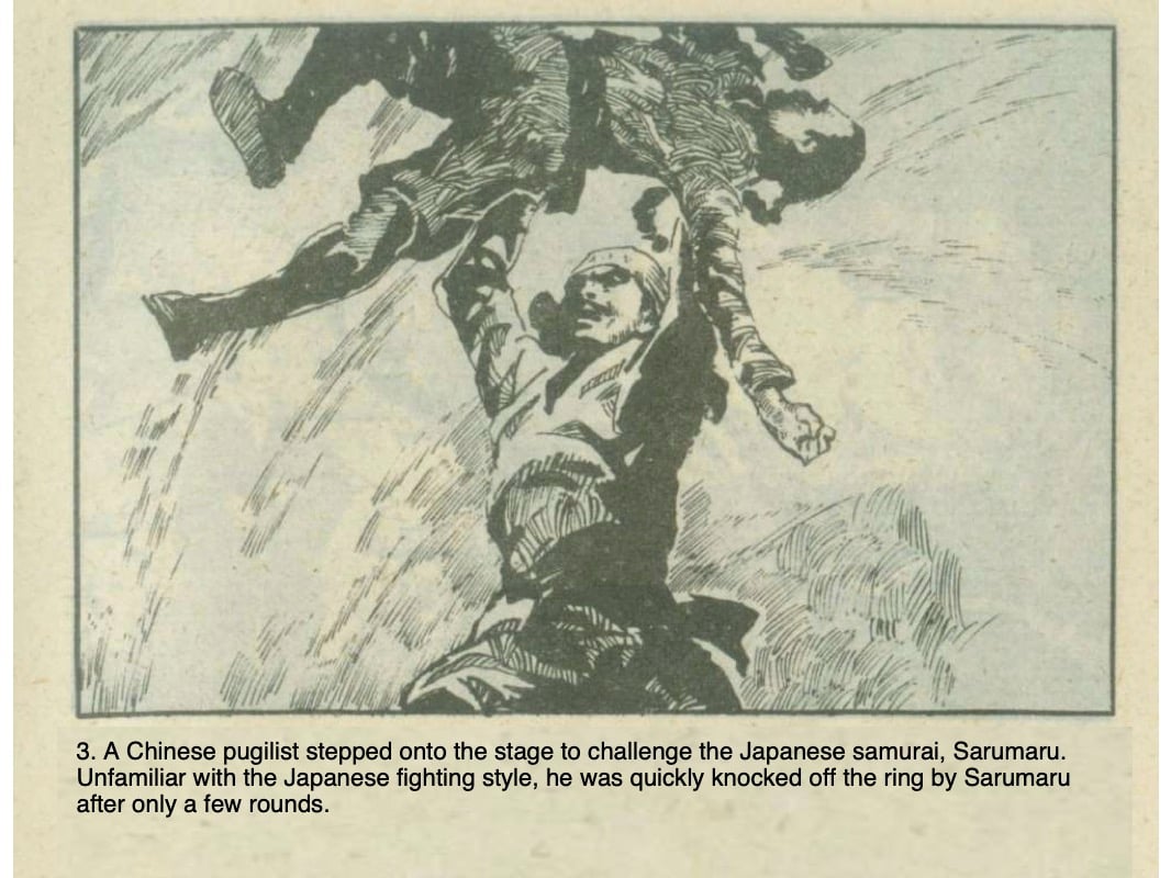 3. A Chinese pugilist stepped onto the stage to challenge the Japanese samurai, Sarumaru. Unfamiliar with the Japanese fighting style, he was quickly knocked off the ring by Sarumaru after only a few rounds.