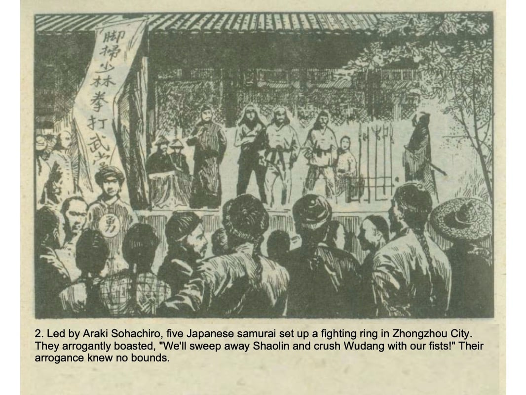 2. Led by Araki Sohachiro, five Japanese samurai set up a fighting ring in Zhongzhou City. They arrogantly boasted, "We'll sweep away Shaolin and crush Wudang with our fists!" Their arrogance knew no bounds.