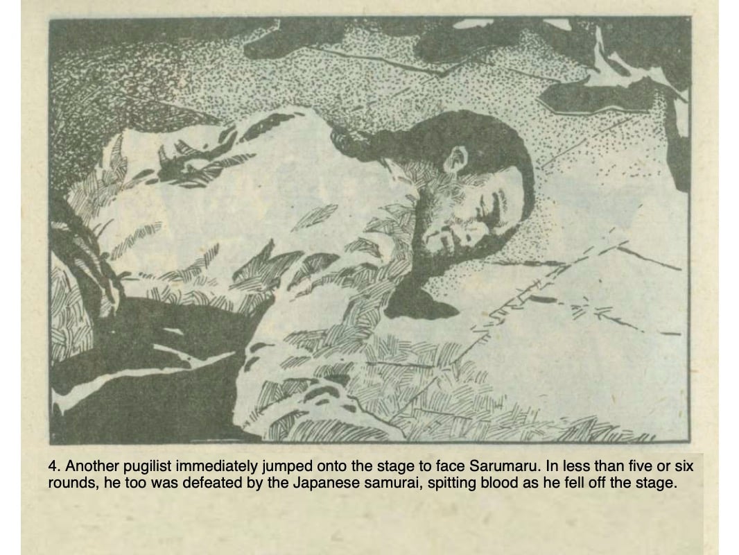 4. Another pugilist immediately jumped onto the stage to face Sarumaru. In less than five or six rounds, he too was defeated by the Japanese samurai, spitting blood as he fell off the stage.