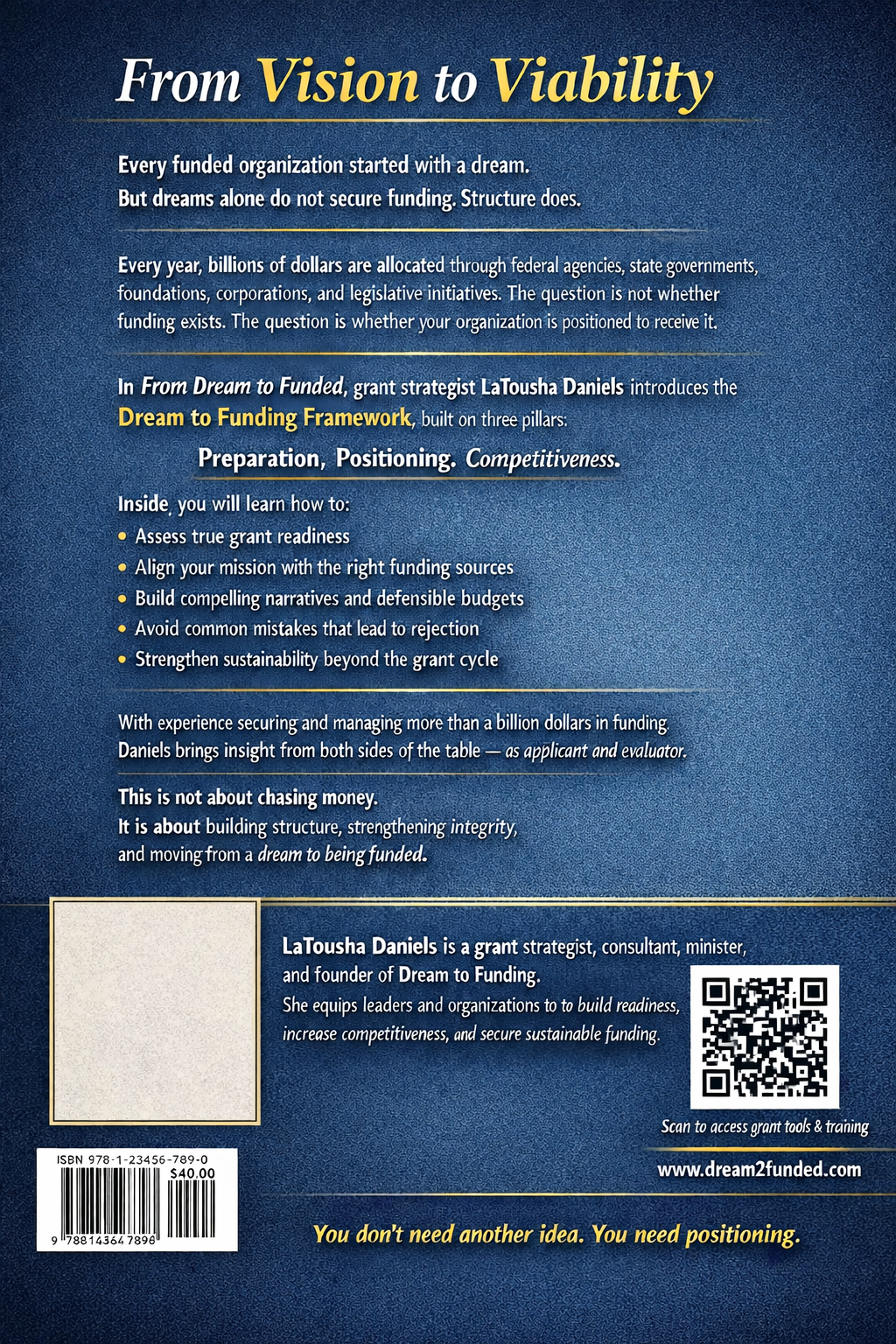 In From Dream to Funded, grant strategist LaTousha R. Daniels introduces a practical framework built on three pillars: Preparation, Positioning, and Competitiveness. Drawing from experience securing and managing over a billion dollars in public and private funding, Daniels equips leaders with the tools needed to move beyond aspiration and into readiness.