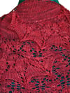 Shawl starts at the center top with a tab cast on. The number of stitches increases with every row from there to the bind off edge. There’s a bit of stockinette at the top, but not all that much, as I’m easily bored when I know the fun lace work is coming, so most of this design’s 117 rows are lace. The lace pattern is easy to knit, every wrong-side row throughout the design is the same, and the overall pattern easy to work, especially once you find your rhythm.