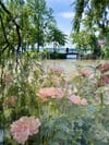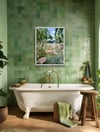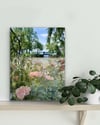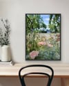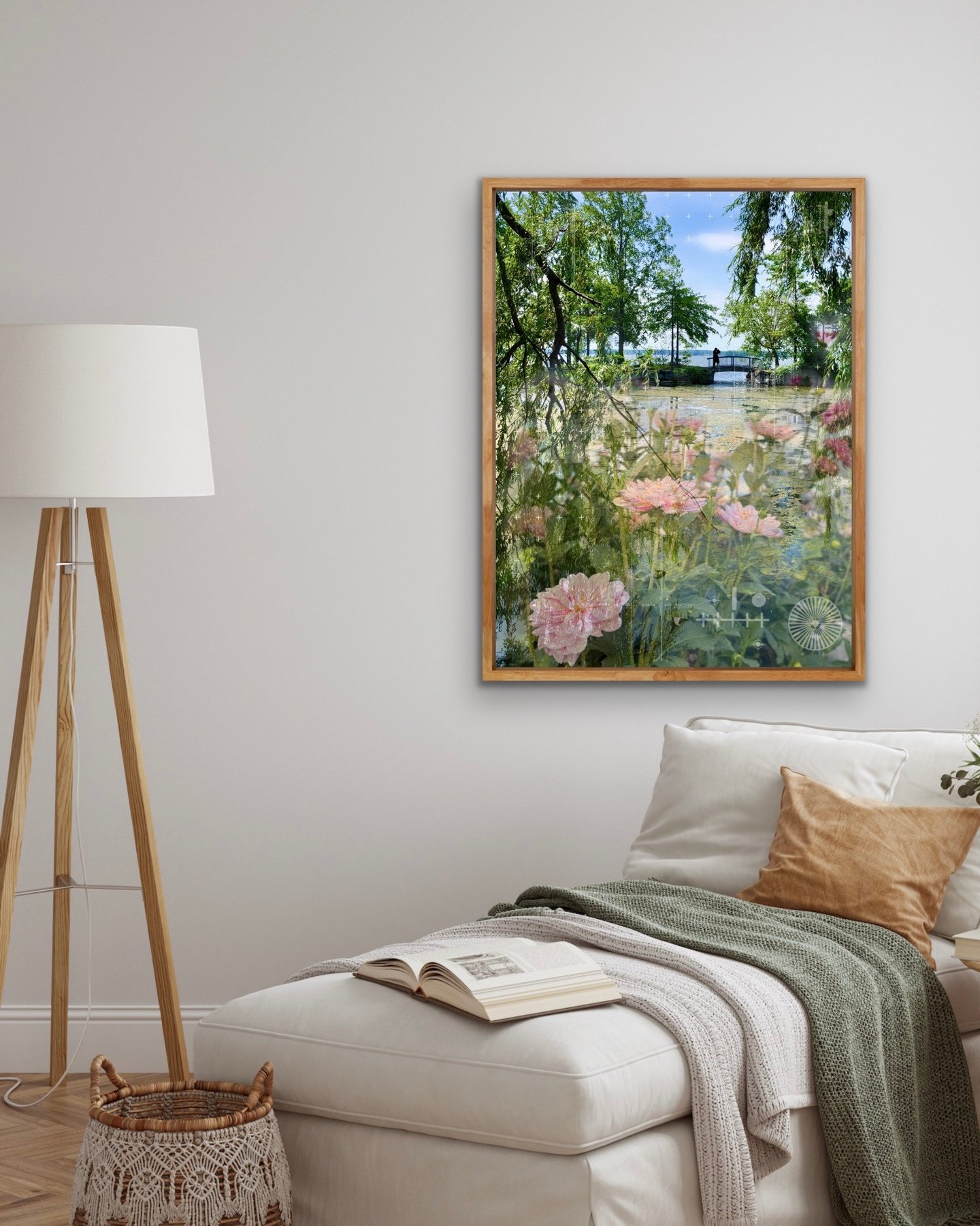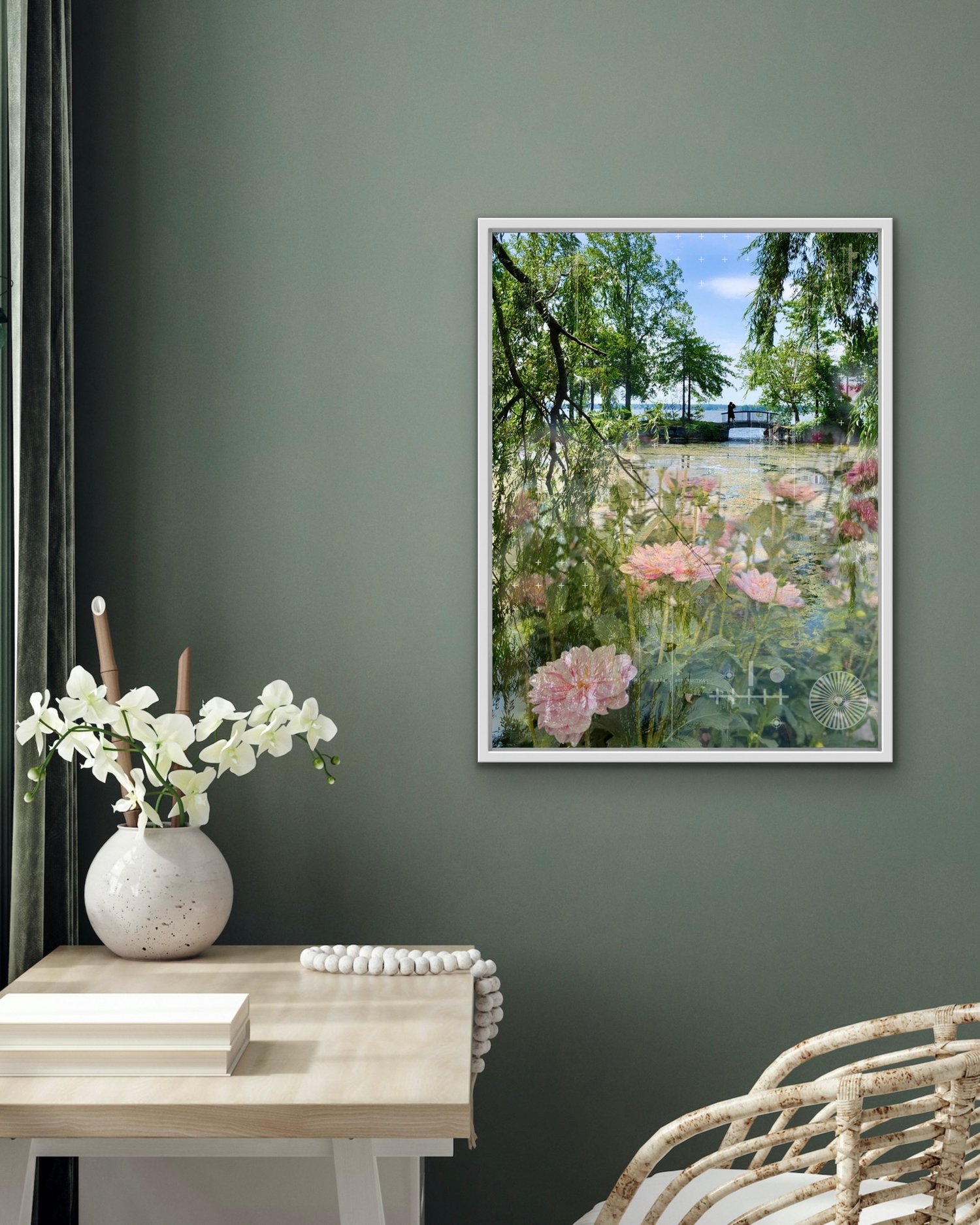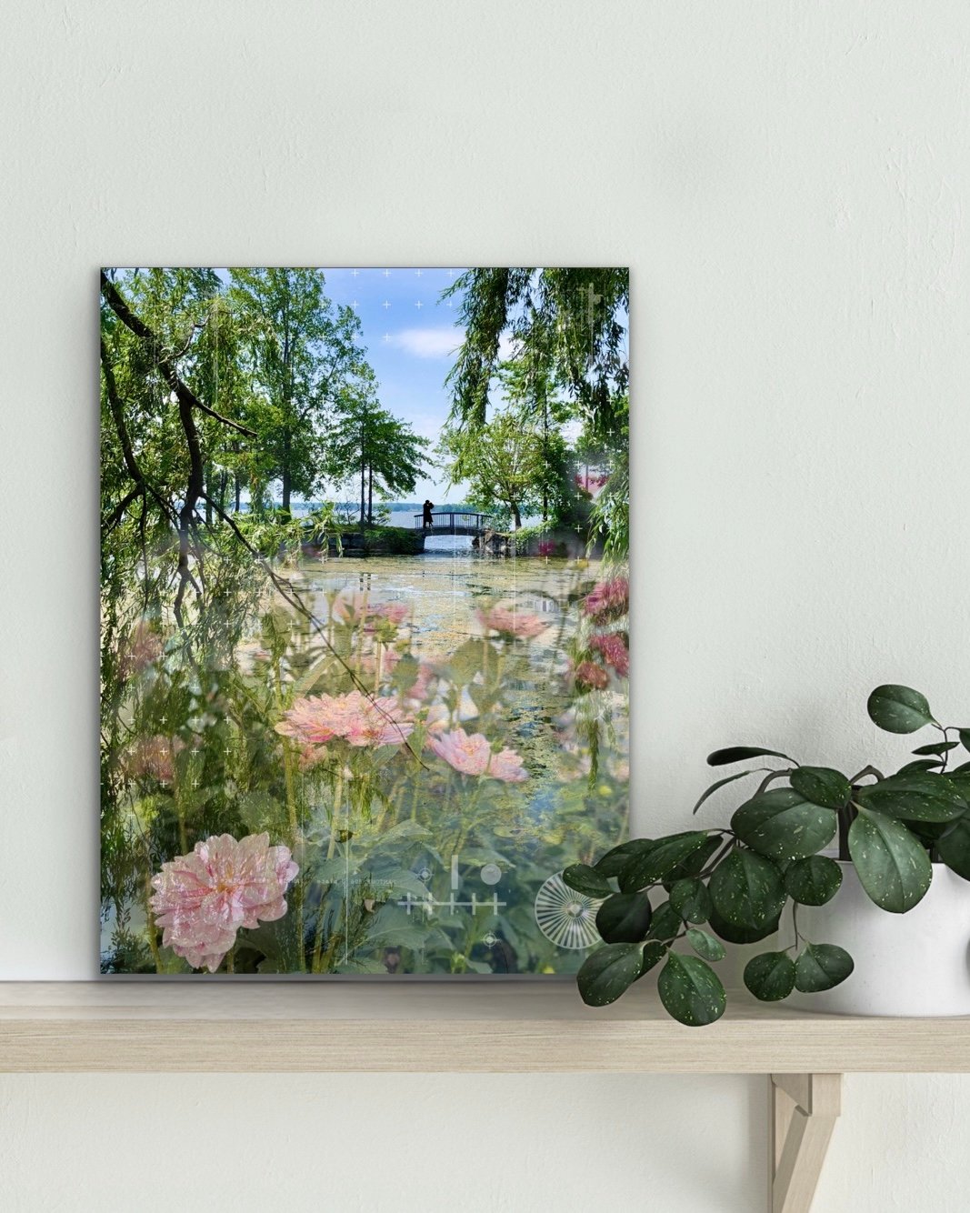 A quiet pond scene becomes a dreamy love story in this layered artwork. A mossy shoreline is softened with delicate pink florals, while a couple embracing on the distant bridge adds a tender, romantic focal point.