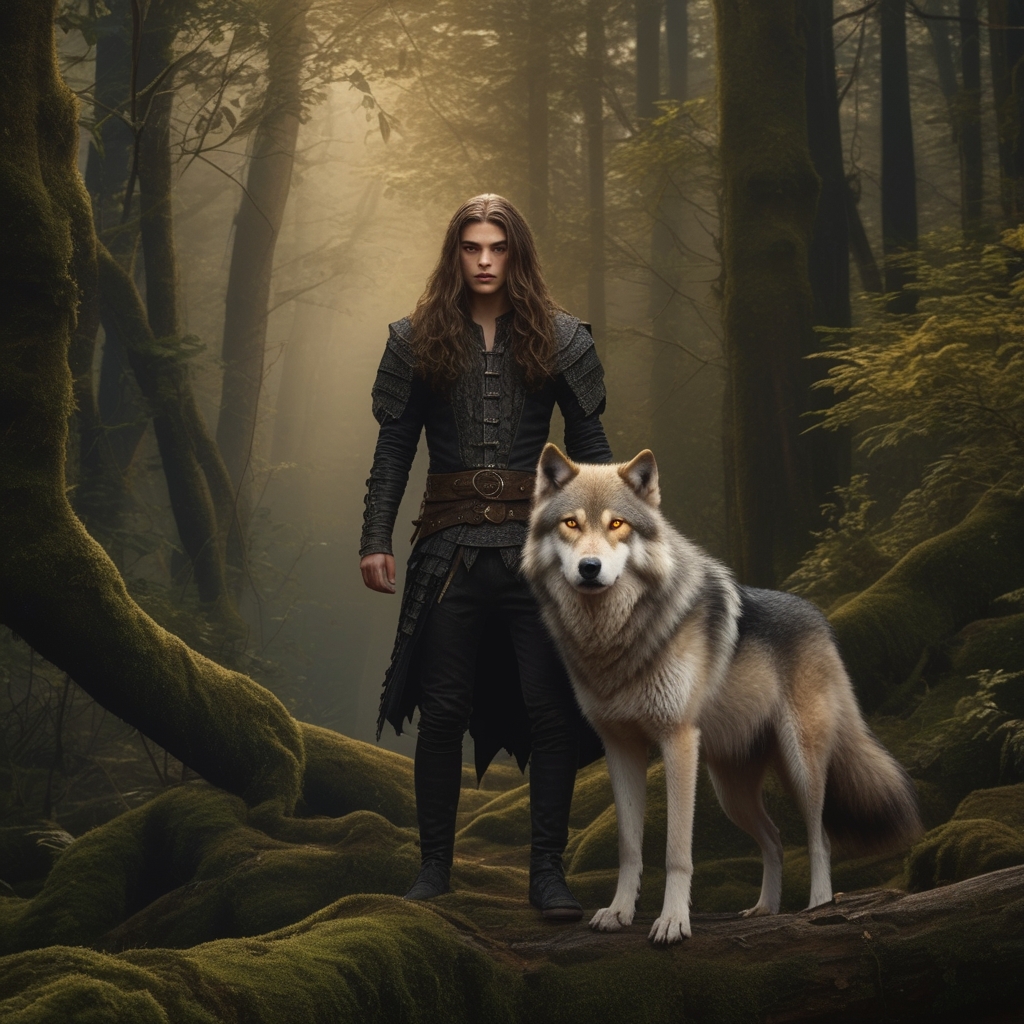 Young Handsome Medieval Rogue with Wolf Companion