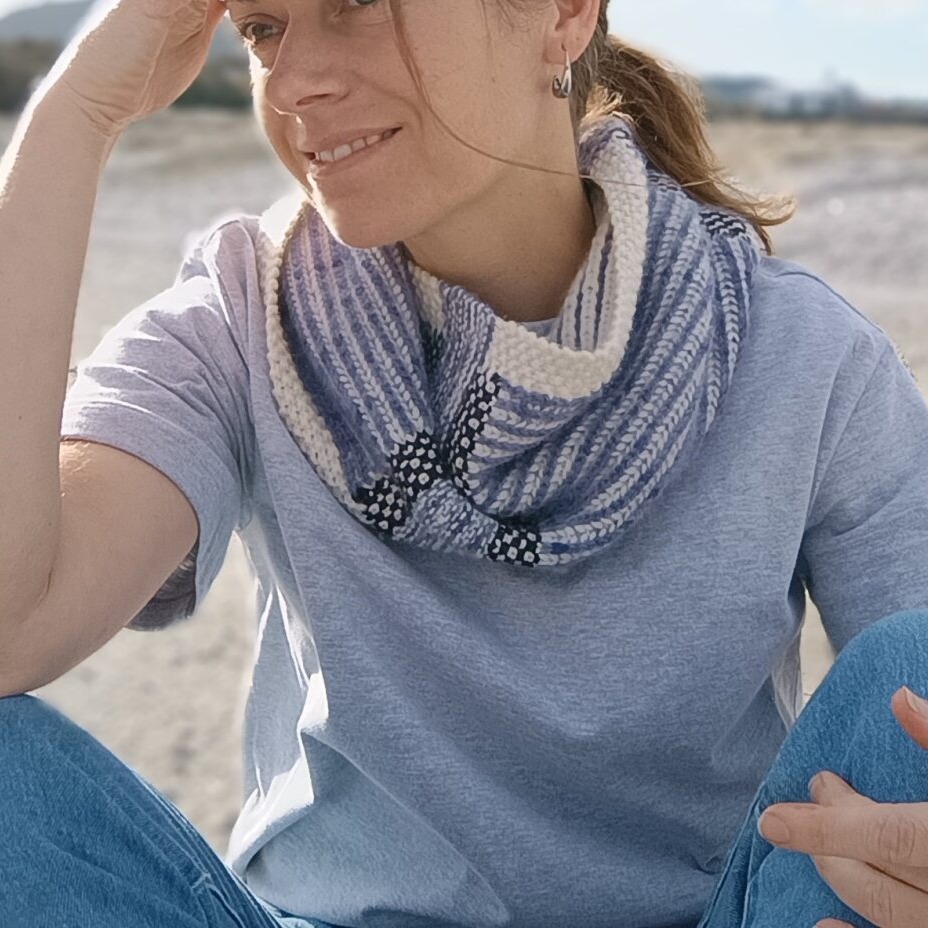 The Bay Panel Cowl is an adaptation of our Bay Panel Shawl, for a faster stash-busting knit. The cowl is in the form of a loop constructed with alternating panels of linen stitch, brioche stitch and garter stitch, with moss stitch borders. A twist in the loop allows it to show off both sides of the work and each of their dominant colours.