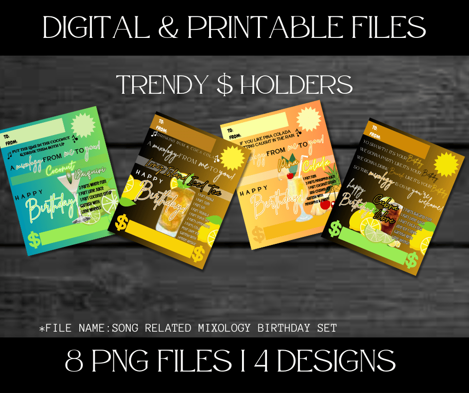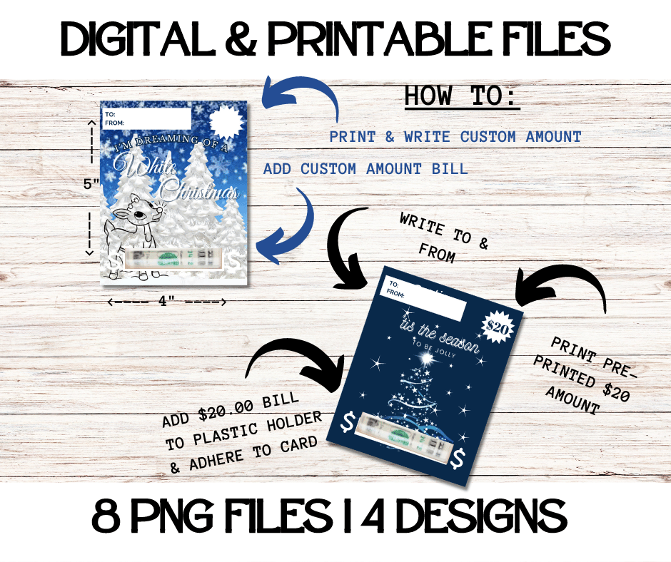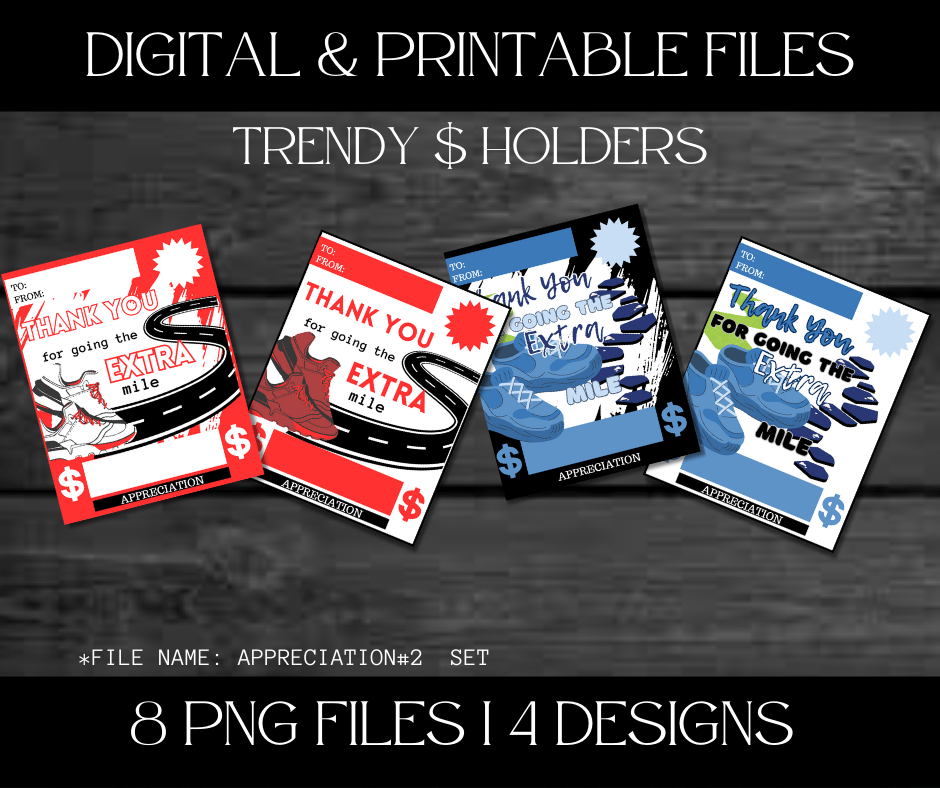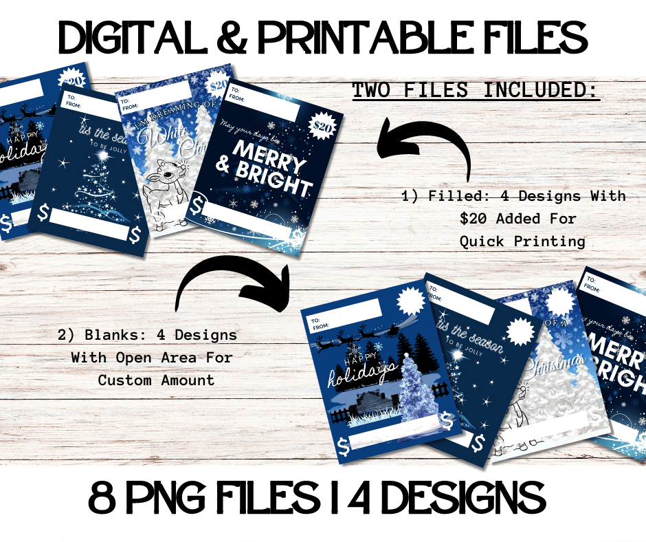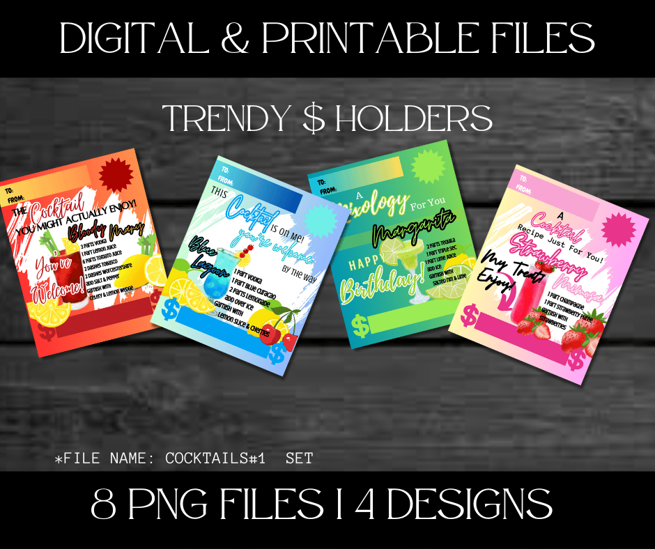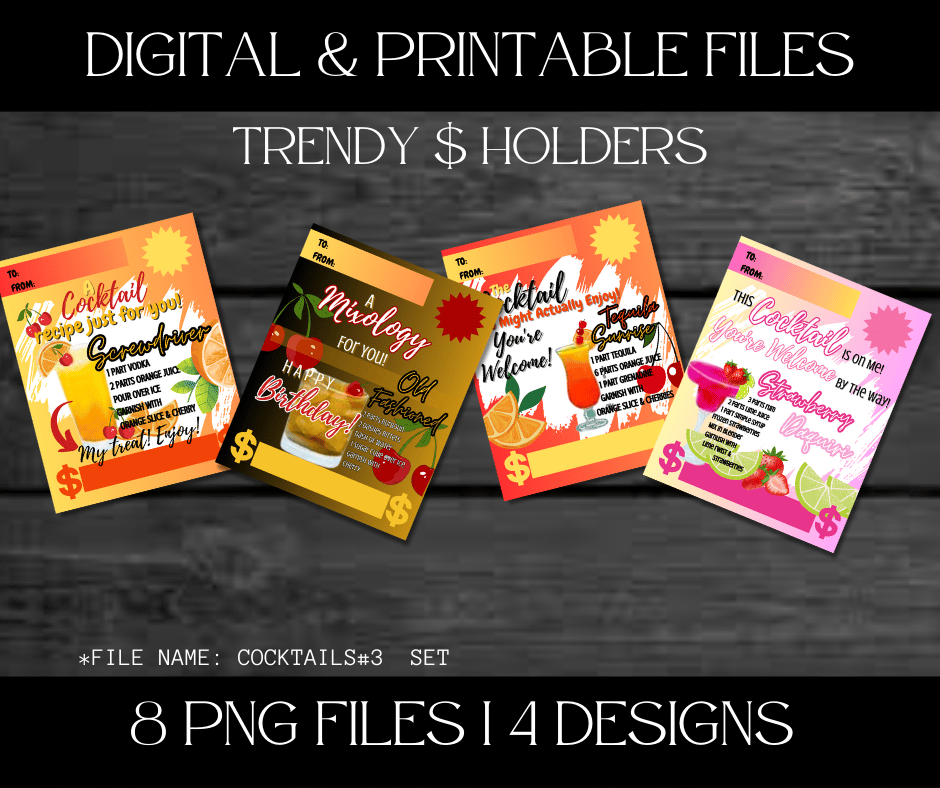 This Trendy $ Holder Cards comes in Zip Files with two PNG Folders. One Folder has Pre-Printed Amounts for Fast Printing. The other Folder has Blanks to write custom amounts. Both Folders has 4 Designs each = 8 PNG Files.
