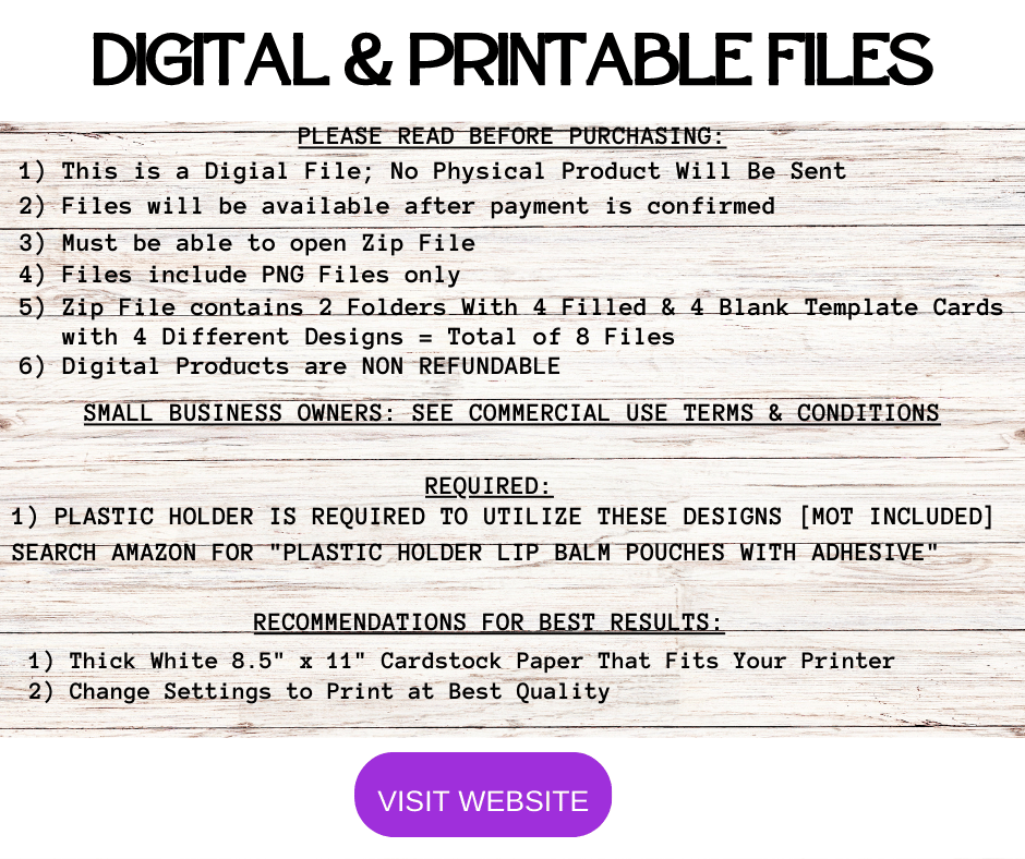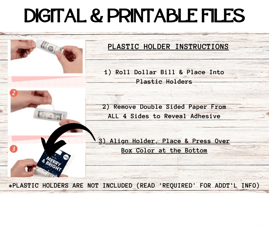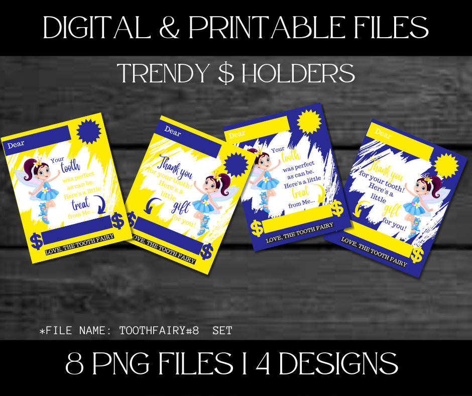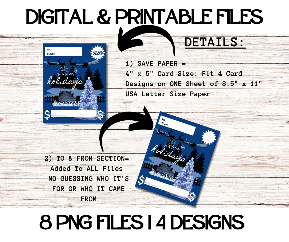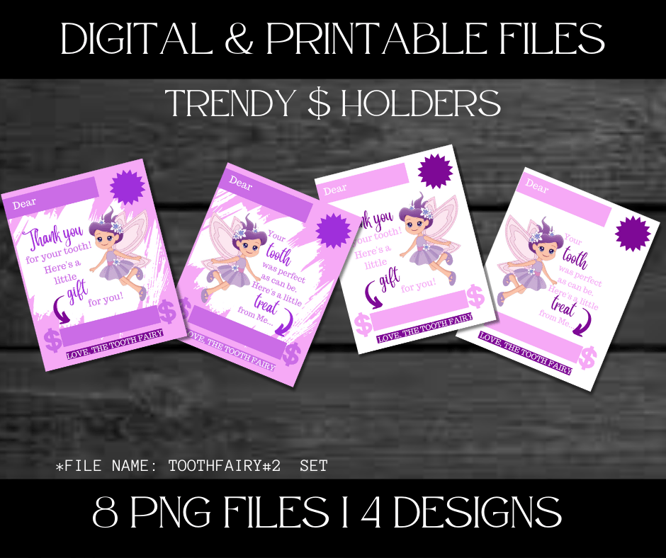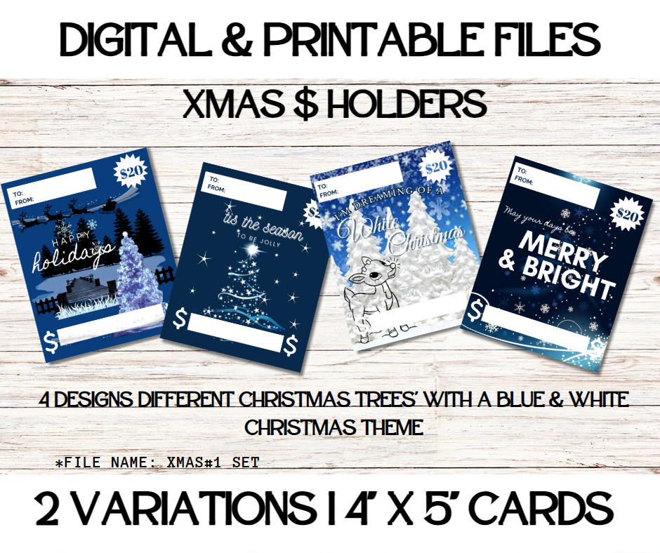 This Trendy $ Holder Cards comes in Zip Files with two PNG Folders. One Folder has Pre-Printed Amounts for Fast Printing. The other Folder has Blanks to write custom amounts. Both Folders has 4 Designs each = 8 PNG Files.