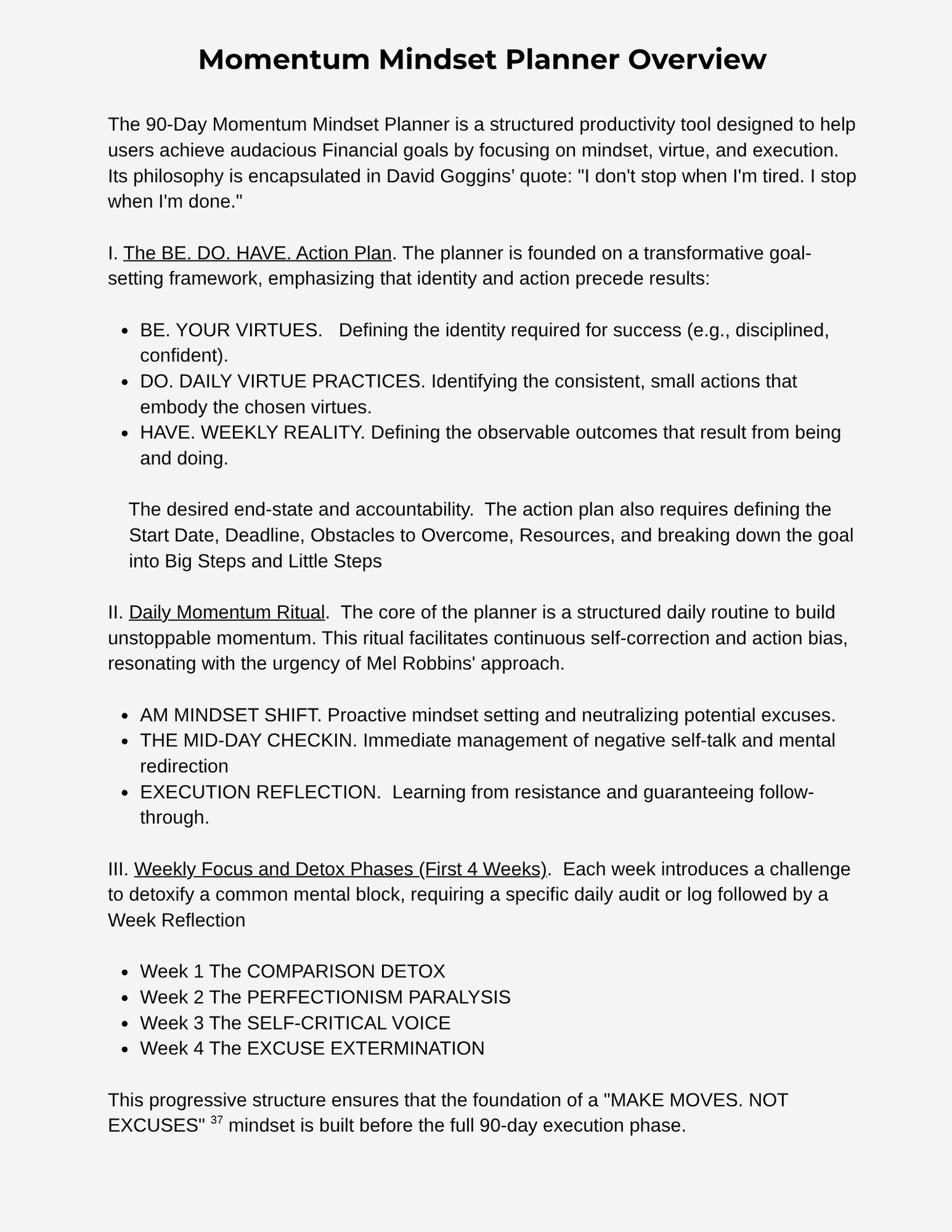The 90-Day Momentum Mindset Planner is not merely a calendar or task tracker; it is a comprehensive, quarterly transformation system designed to align a user's identity, actions, and results to achieve a major Financial Goal. It is built on the philosophy of minimizing mental friction and maximizing sustained, unstoppable execution.