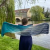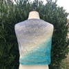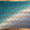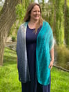 Once you reach the end of the first blank, the next one is cast on from the lightest point. So in the centre you get a lovely pool of light yarn, and when the wrap was on the blocking mats it looked like a ray of sunshine was shining across the middle – so the name became the RiverRay Wrap!