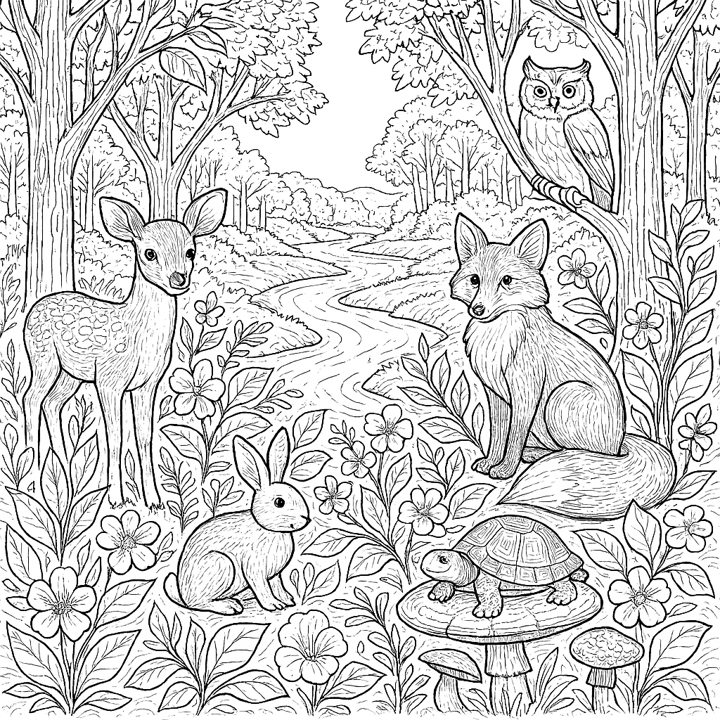 Step into a serene woodland scene with this Peaceful Forest Friends Coloring Page, featuring beautifully detailed animals nestled among trees and flowers. A gentle deer, curious fox, wise owl, bunny, and turtle gather near a winding stream — inviting calm, creativity, and reflection.
