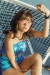 This album includes 332 photos, UNCENSORED. It includes a metallic sporty set on a tennis court, a sexy bikini set by the pool, and a boudoir set (topless).