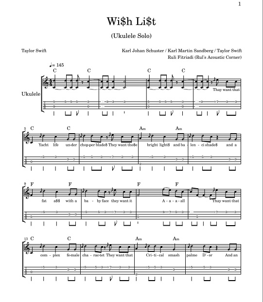 Taylor Swift - Wi$h Li$t (Ukulele Solo Sheet Music PDF + Mp3 Audio)