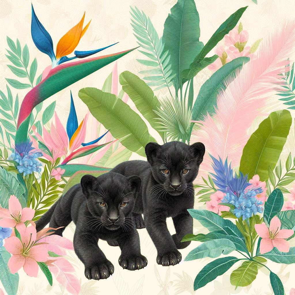 2 black panther cubs in a jungle with pink & green leaves & a tall colourful exotic plants & flowers. There is a river which ripples, & there are colourful parrots. . The background is purple & pink textured leafy patterns.