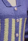 I liked the idea of using a vertical stripe pattern, but wanted something easy to knit. The striped section of this sweater is knit sideways, and the top portion is then picked up and knit to the shoulders, a simple way to add color and interest. The cardigan goes great with its matching short sleeve pullover (Pattern 108).