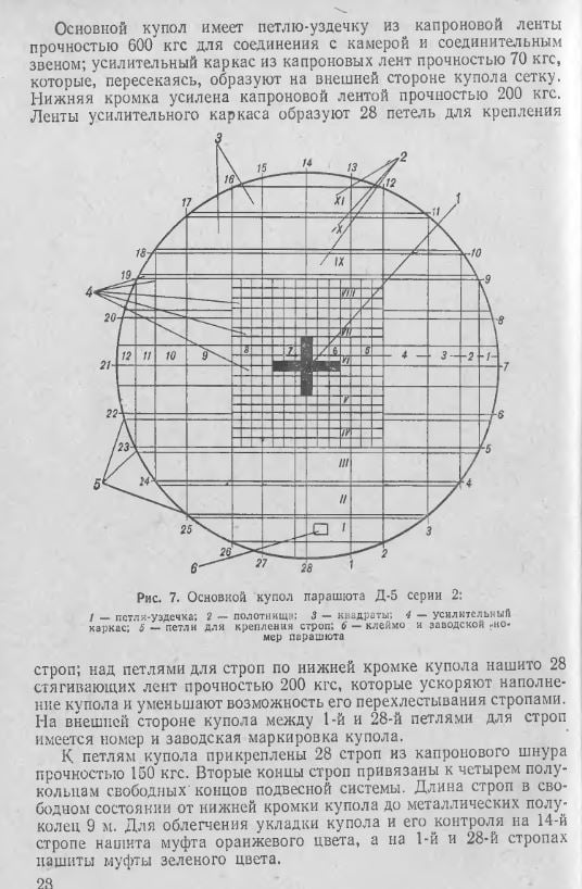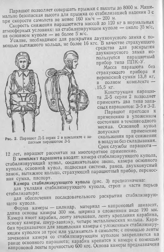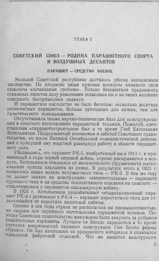 The publication provides the history of the creation of a parachute, the types of parachutes, the basics of ground training for a parachutist, the rules for jumping from an airplane, parachute-cargo systems are considered relevant for that time, the storage and operation of airborne equipment