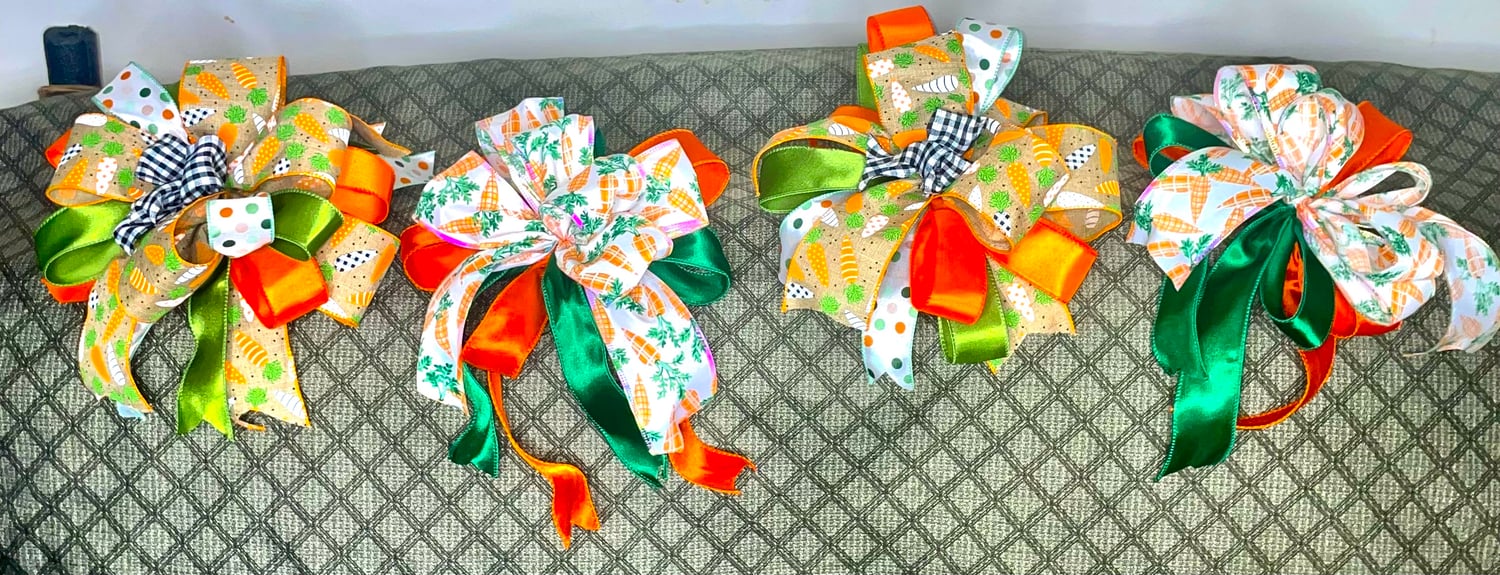 Bring cheerful, garden-inspired charm to your décor with these beautifully handcrafted statement bows. Each piece is layered with premium wired ribbons featuring vibrant carrot prints, playful polka dots, classic gingham, and rich satin accents in fresh spring tones of orange and green. Carefully shaped for fullness and durability, these bows hold their form and make an eye-catching focal point anywhere they’re displayed.