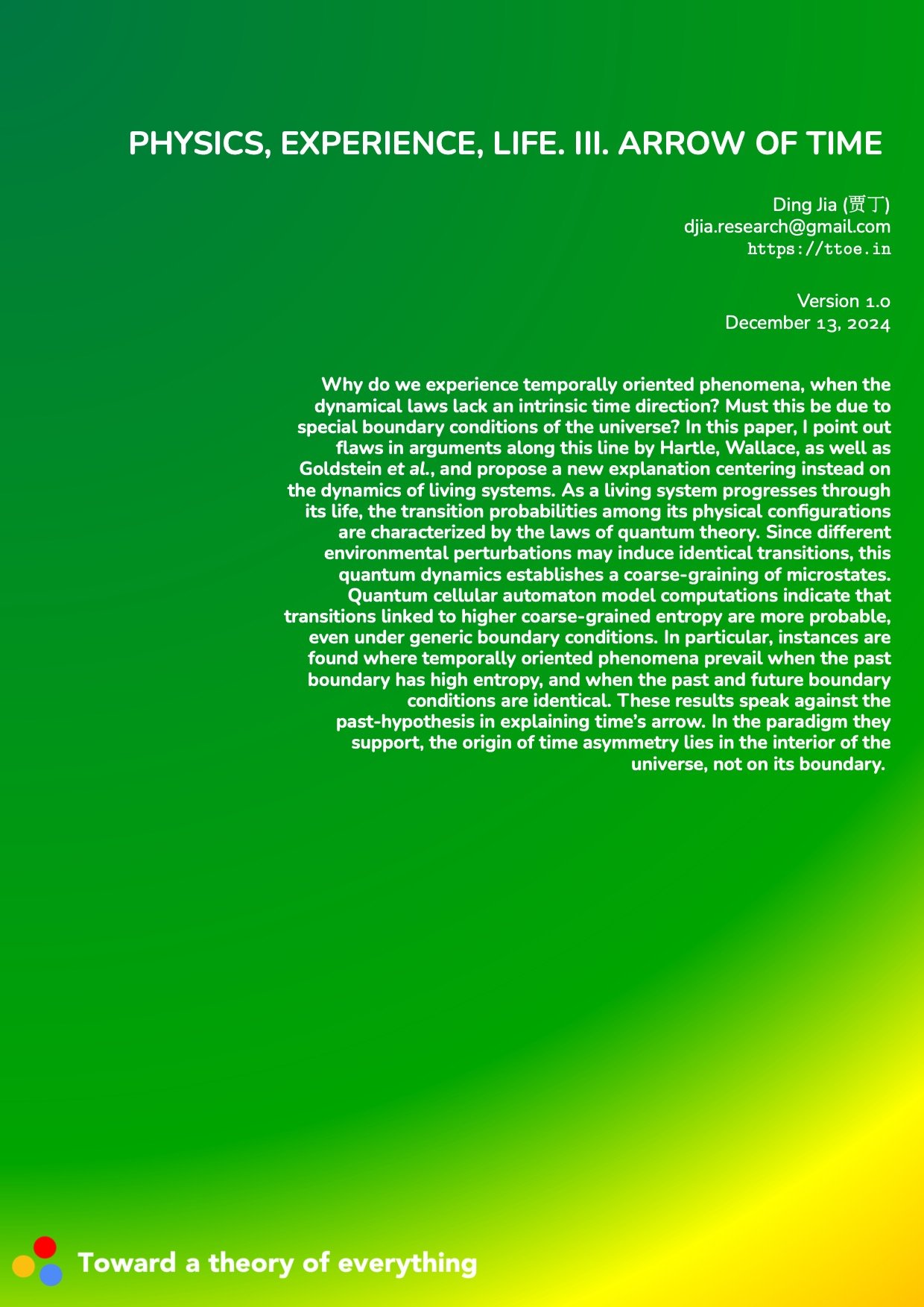 Abstract: Why do we experience temporally oriented phenomena, when the dynamical laws lack an intrinsic time direction? Must this be due to special boundary conditions of the universe? In this paper, I point out flaws in arguments along this line by Hartle, Wallace, as well as Goldstein et al., and propose a new explanation centering instead on the dynamics of living systems. As a living system progresses through its life, the transition probabilities among its physical configurations are characterized by the laws of quantum theory. Since different environmental perturbations may induce identical transitions, this quantum dynamics establishes a coarse-graining of microstates. Quantum cellular automaton model computations indicate that transitions linked to higher coarse-grained entropy are more probable, even under generic boundary conditions. In particular, instances are found where temporally oriented phenomena prevail when the past boundary has high entropy, and when the past and future boundary conditions are identical. These results speak against the past-hypothesis in explaining time’s arrow. In the paradigm they support, the origin of time asymmetry lies in the interior of the universe, not on its boundary.