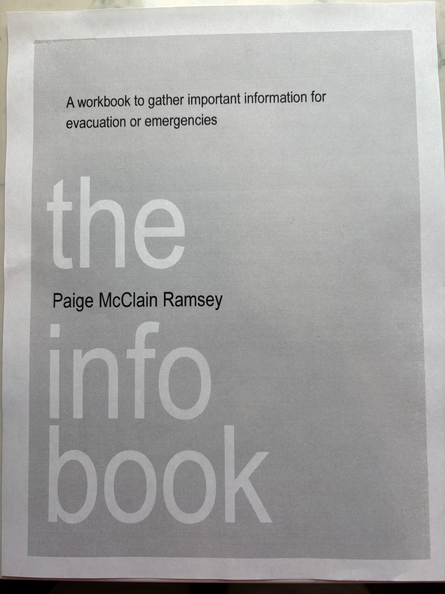 The Info Book is a workbook designed to gather important information for evacuation or emergencies. With all the recent fires, tornados, and hurricanes it became more important than ever to have ALL your information gathered and documented. It is also just as important for you to have this for your spouse or family/friends in the case of an accident or death.