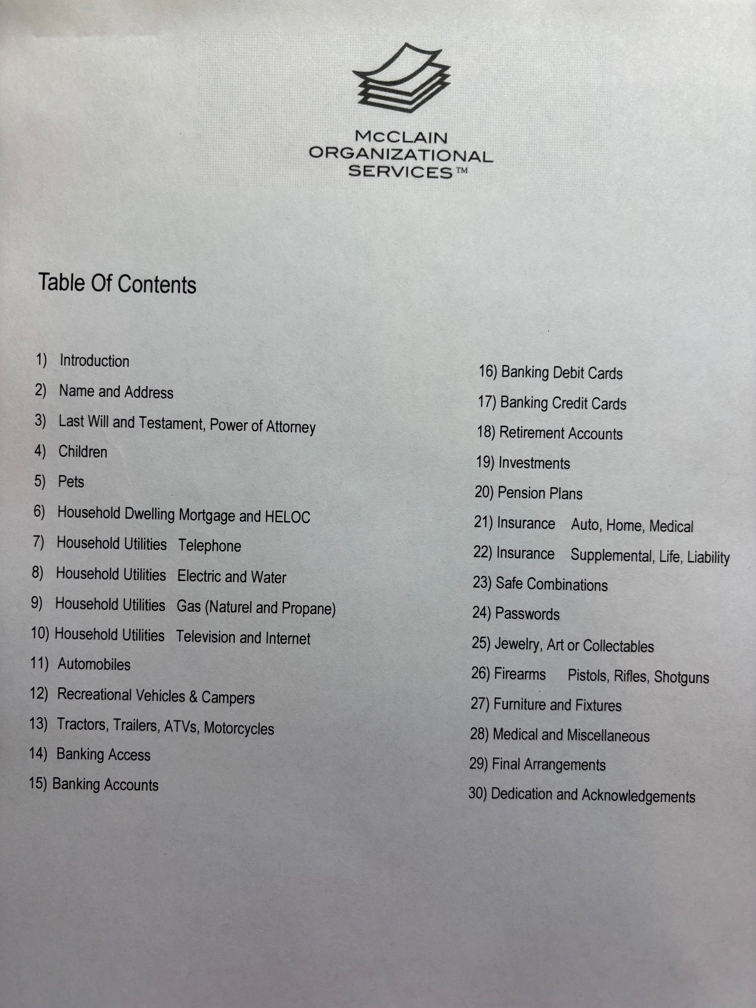 When we lost my father to multiple myeloma in January 2019, I was not prepared. It all happened so fast - he went into the hospital on Christmas Day and passed away January 31, 2019. If only I had done this book with his info BEFORE we needed it! I encourage you to gather this information before you need it. After the fire it's too late, after the tornado it's too late, and after your loved one is unconscious it's too late to be asking the questions! While I was creating this book, I was gathering all the info for Jay and me, and it took some time. Gather your info! It is worth your time to have this documented for yourself or your family and loved ones! You may or may not encounter a natural disaster, but when our days are up, we will leave this world. Having your info book to leave behind is a gift to those who will be handling your affairs. Let the info book be a legacy of love to those left behind.