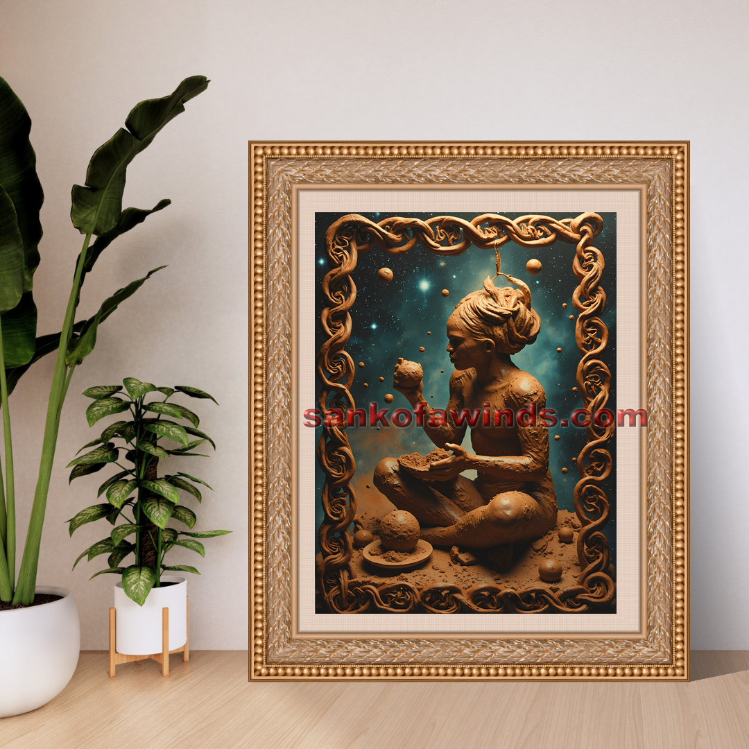 Behold the first human, perfectly formed from the clay of a new Earth, experiencing a moment of pure, unadulterated joy. This figure, sculpted from the very ground they sit upon, savors the "first fruit"—a symbolic taste of consciousness, life, and the world they are destined to inhabit. Set against the profound depth of a star-dusted night sky, the scene is one of serene completion and nascent potential.