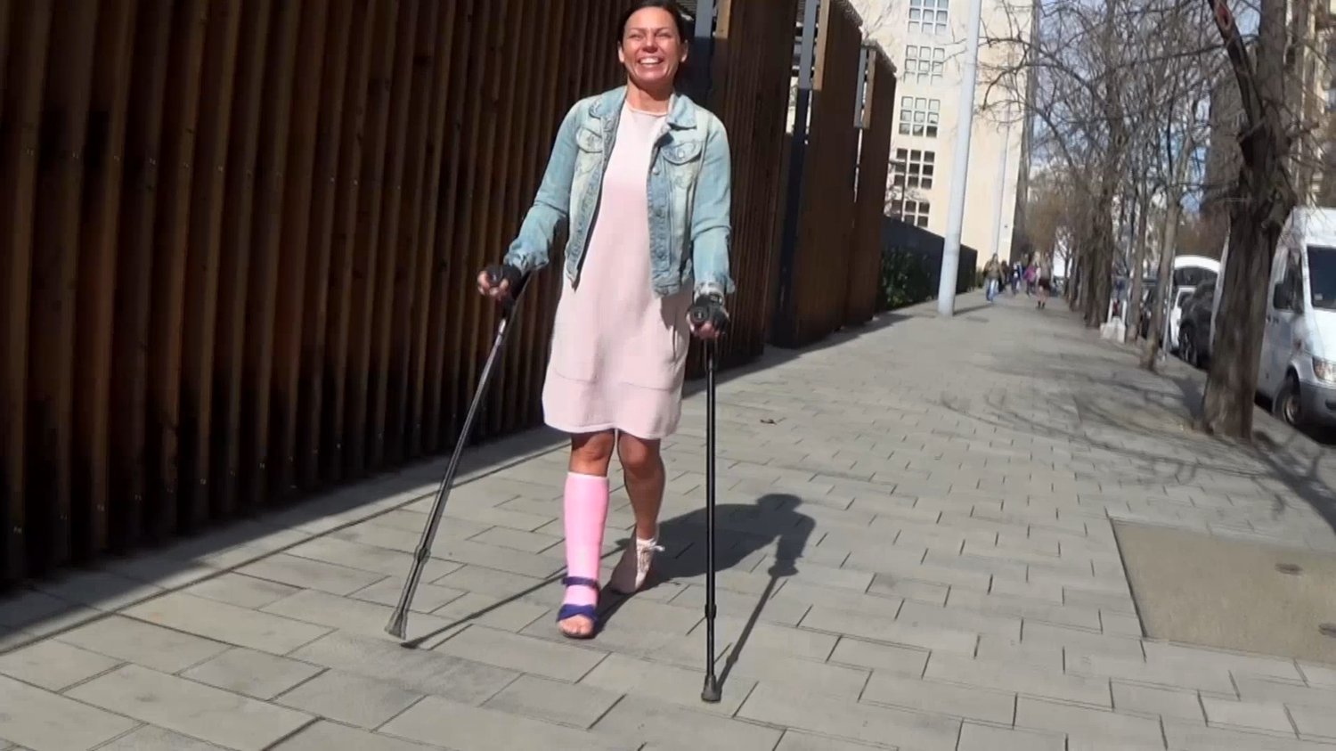 Adriana is walking with her pink short leg cast in a cast shoe on the streets of Budapest.After a lot of walking her ankle start to hurt and she think it´s best if she cont put weight on her leg and start crutching.She show us the great Parlament in Budapest before she starts walking at the Metro to go home.
