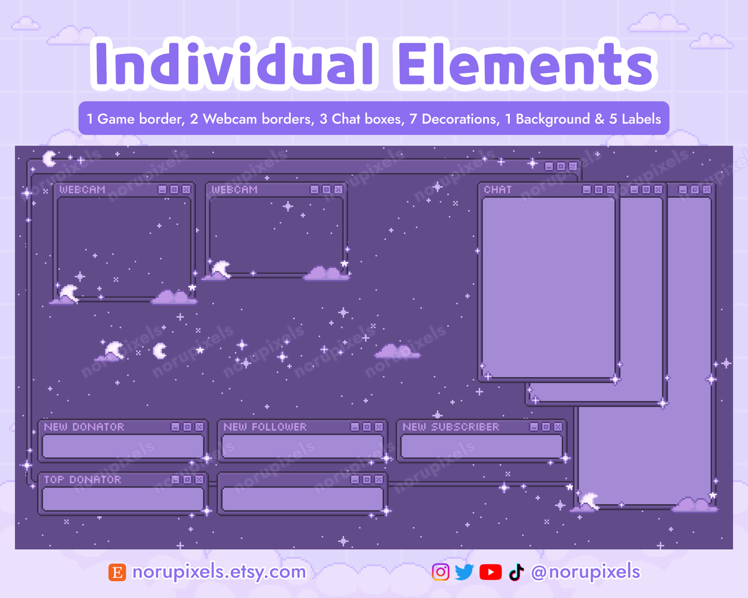 - Individual elements from overlay: 1 game border, 2 webcam borders, 3 chat boxes, 7 decorations, 1 background & 5 labels (.PNG format & transparent backgrounds)