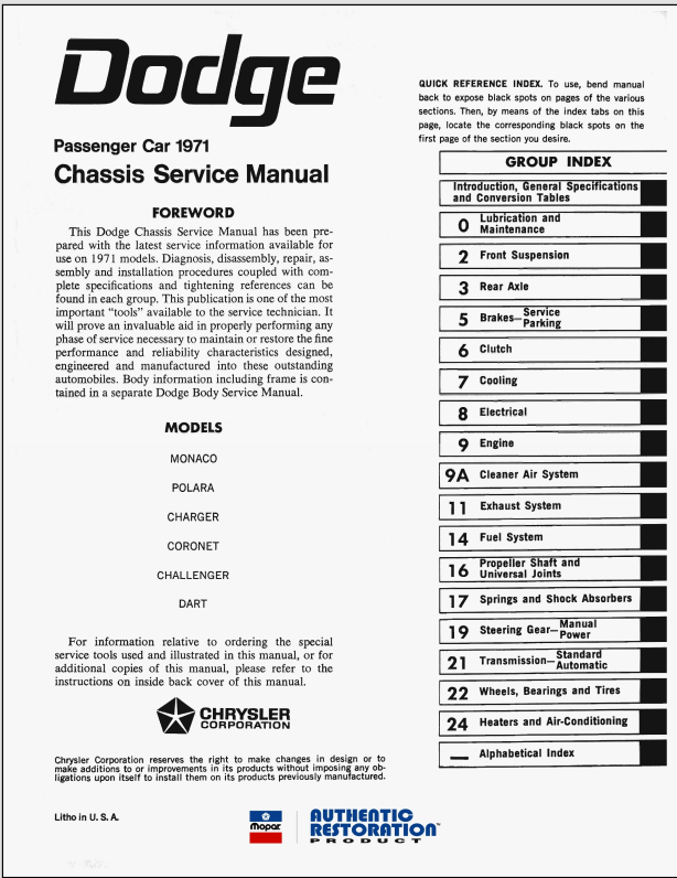 1971 Dodge Challenger Dart Charger Coronet Polara Monaco Chassis Service Manual