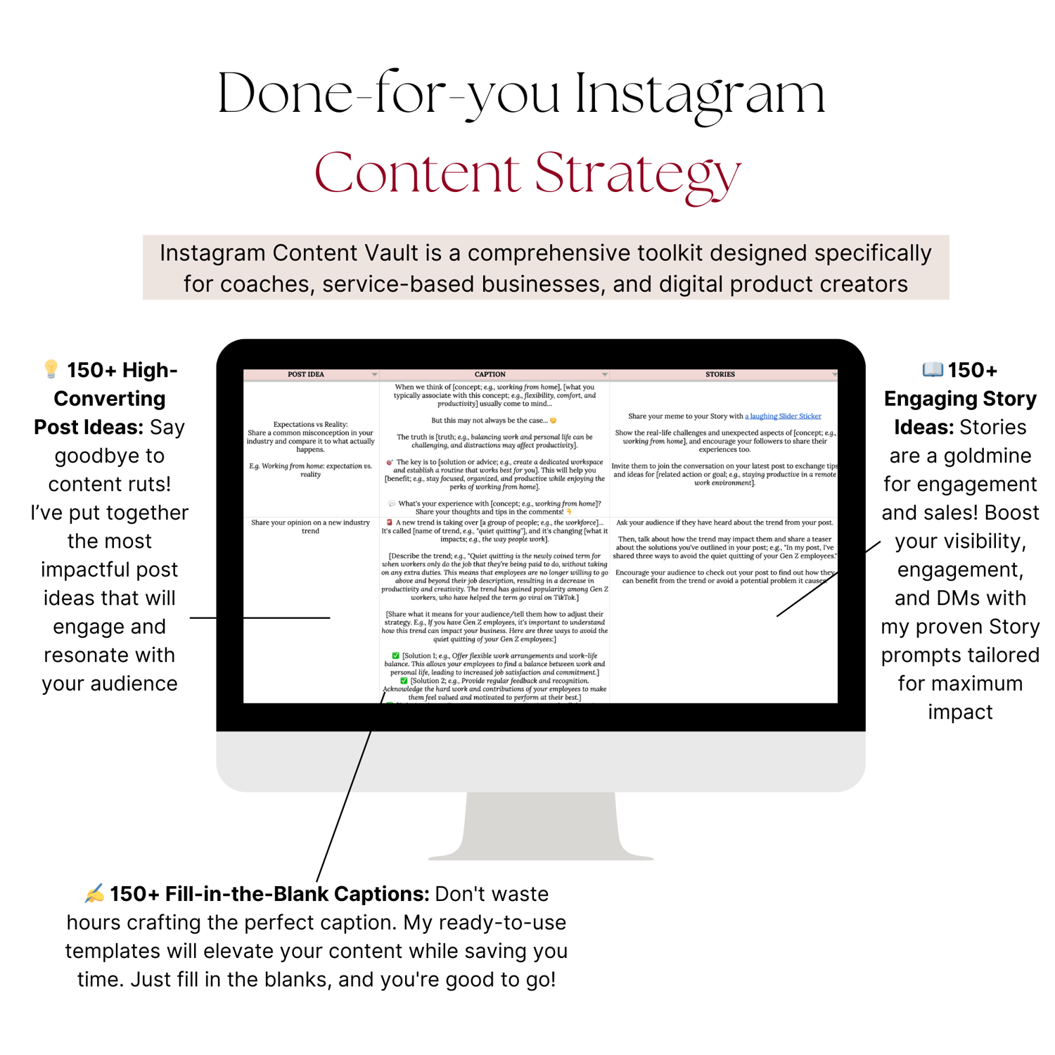 Instagram Content Vault is a comprehensive toolkit designed specifically for coaches, service-based businesses and digital product creators.