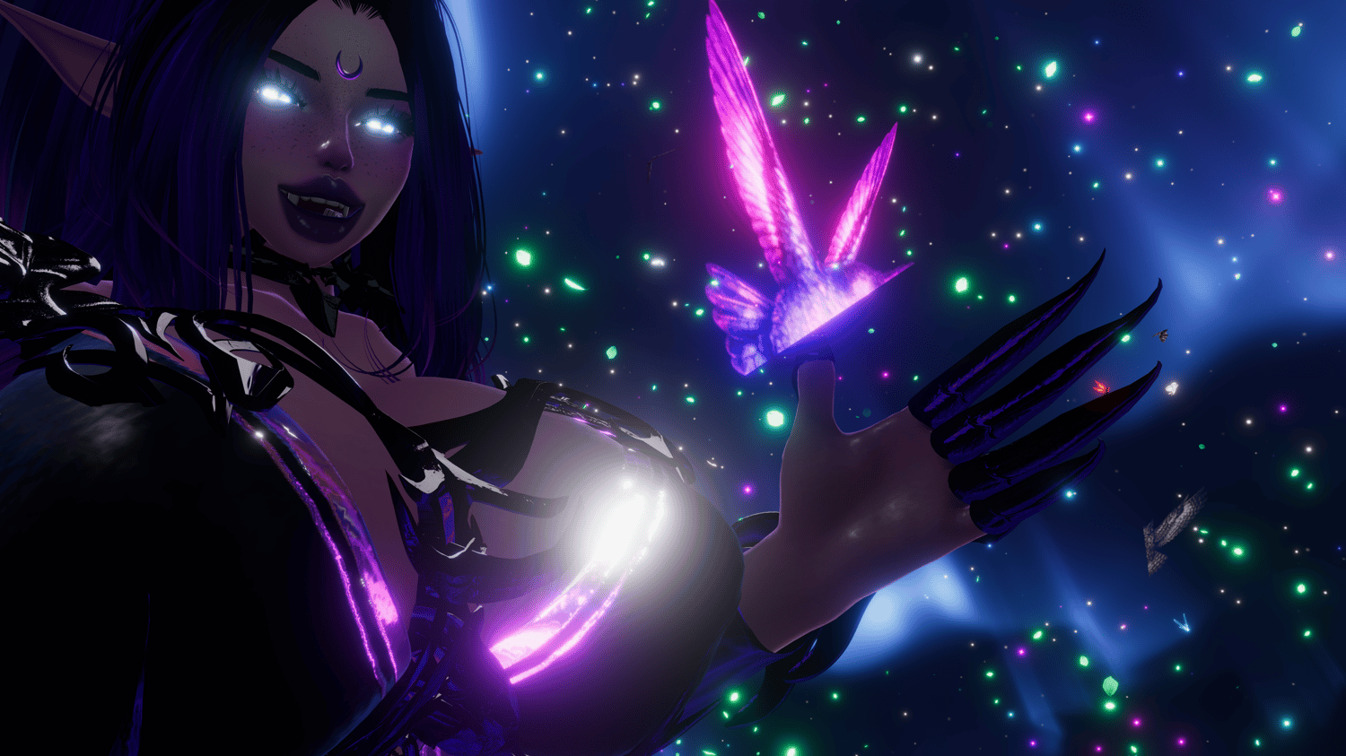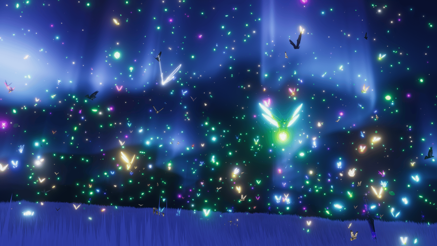 Forest Friends is a cozy, magical VRChat avatar prop that lets you summon flying animals, insects, and forest-themed particle effects that move naturally around you — complete with wing flapping, drifting leaves, and reactive effects like headpats and footsteps.