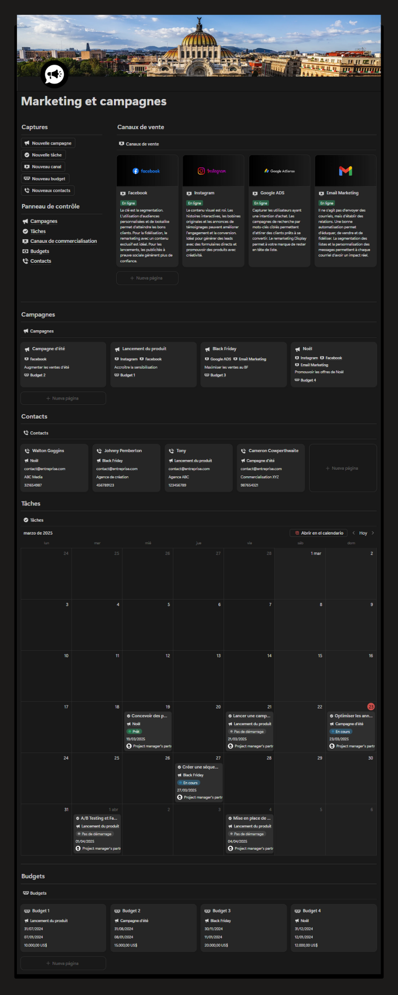 Organisez et optimisez vos canaux de communication. Que ce soit les réseaux sociaux, l'email marketing, la publicité payante ou le marketing de contenu, gardez une vue d'ensemble claire de chaque stratégie.