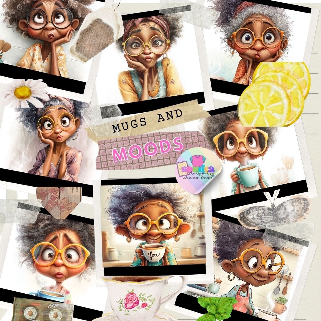 Mugs and Moods: Cute Granny Sticker PNG Bundle | Afro Grannies Sipping Tea | Digital Download for Planners, Journals, Crafts + Upscaled Files