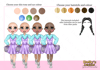 three different skin tones, three eye colours and 6 hair colours