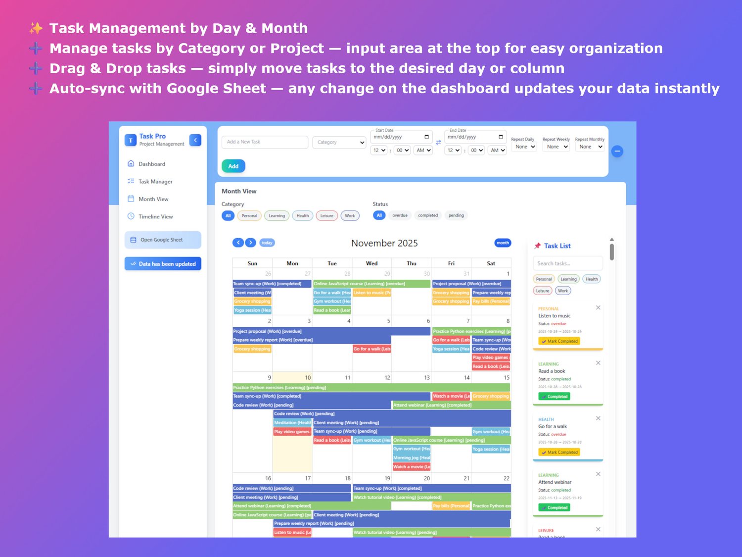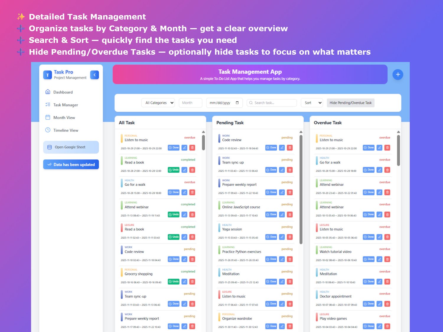 🔹 A modular productivity system combining Google Sheets, React + Tailwind UI, drag & drop workflow, and scalable architecture for modern task management.