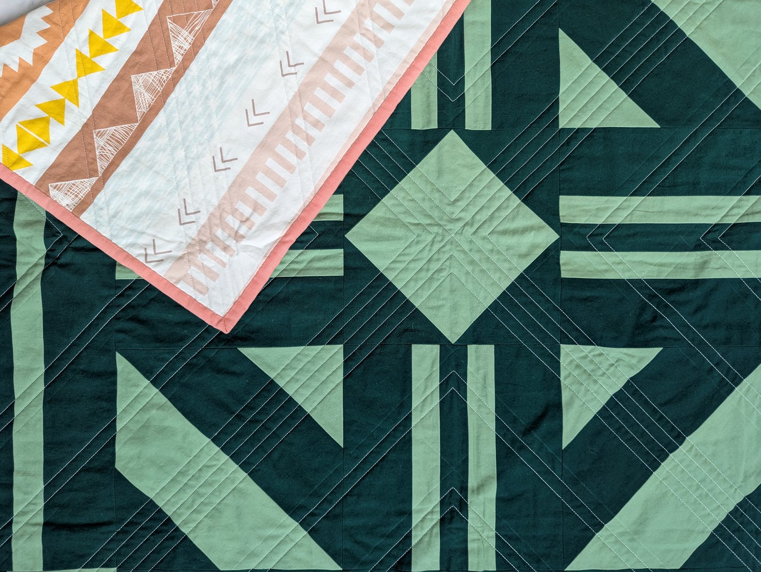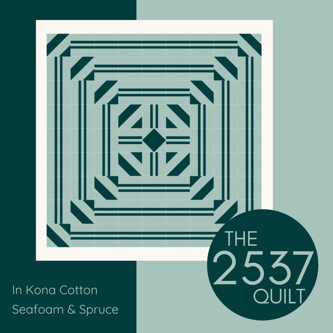 My versions of The 2537 Quilt are made with: Kona Cotton Spruce and Ice Peach, and Kona Cotton Spruce and Old Green. But I can't wait to see your own version of The 2537 Quilt! Be sure to use the hashtags #the2537quilt and #millieandbundesigns on Instagram so I can see what you have put together.