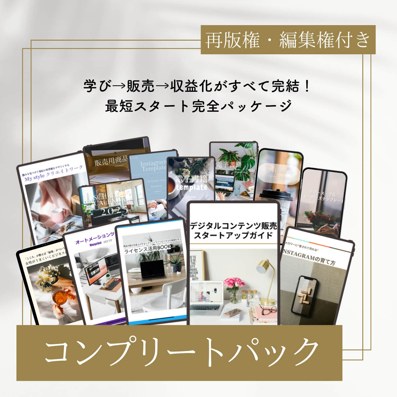 このコンプリートパックがあれば、再販売可能なデジタルコンテンツの知識・ツール・商品だけでなく販売の仕組みまで全てがそろい、今日からあなたも販売スタートできます。