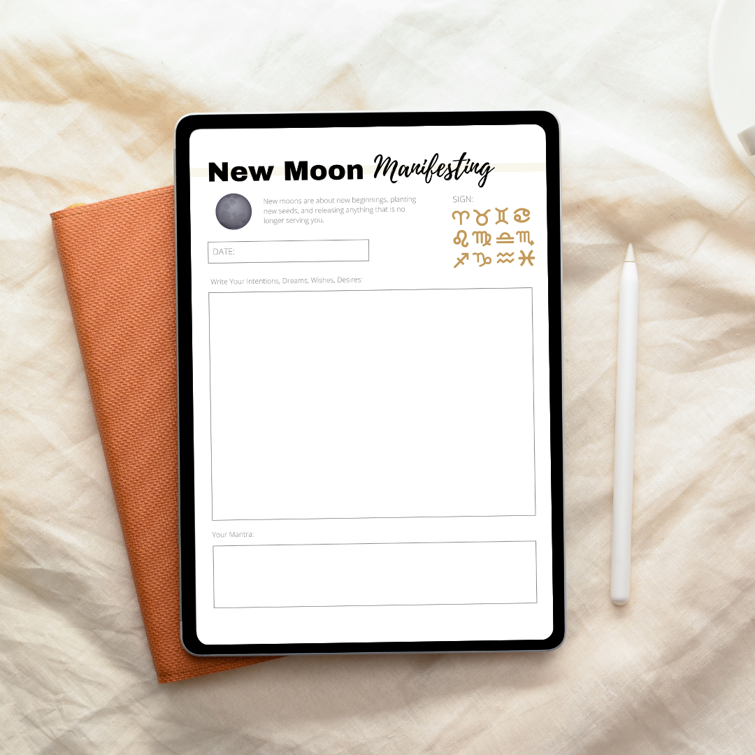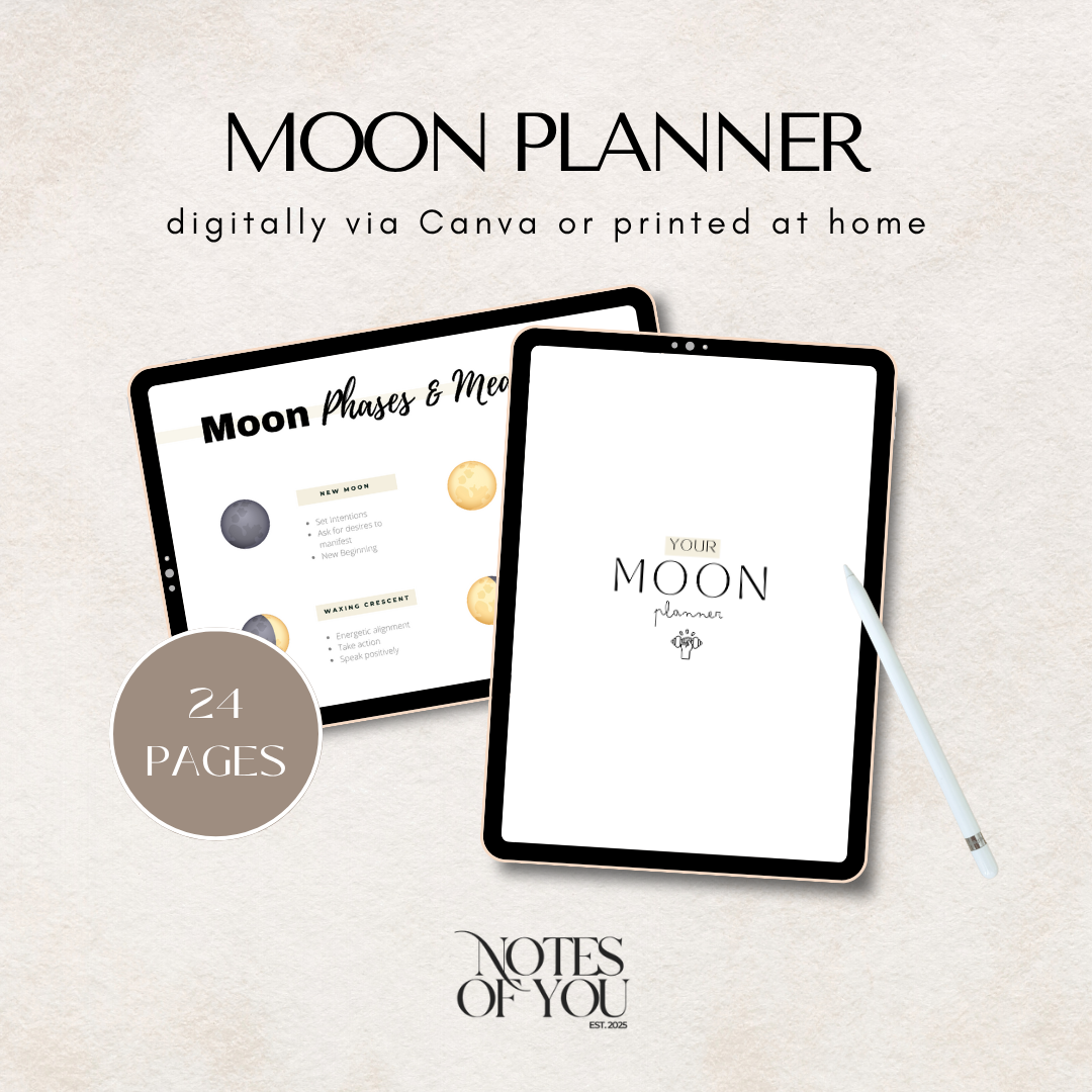 This 24-page Moon Planner & Manifestation Journal is your sacred guide to aligning with the lunar cycles for deeper self-discovery, manifestation, and spiritual growth. From understanding the meaning of each moon phase and practicing New Moon intentions to Full Moon release rituals, this printable and editable journal invites you to harness the moon's energy, set powerful intentions, and manifest your desires. Whether you're a seasoned moon follower or just beginning your lunar journey, this planner lovingly supports you through every phase of the cosmic dance.